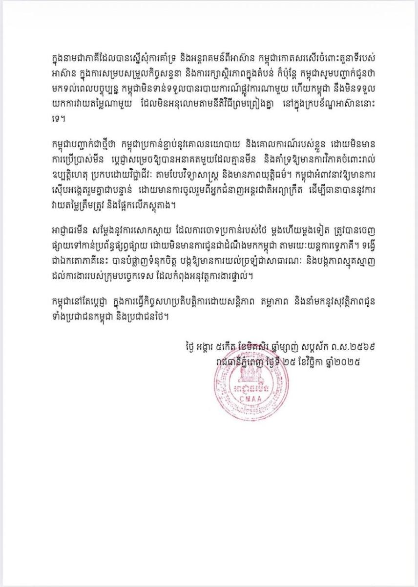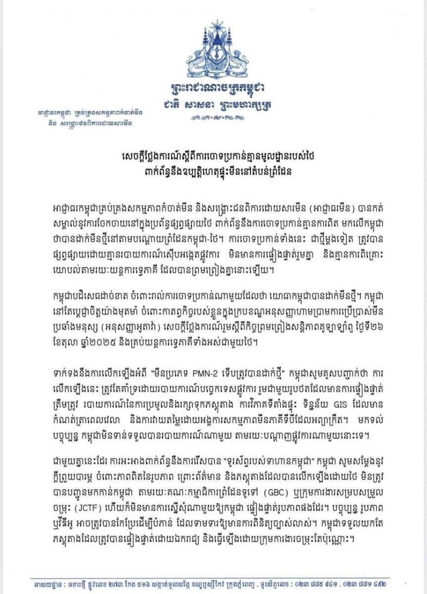កម្ពុជាបដិសេធដាច់ខាត ចំពោះរាល់ការចោទប្រកាន់ណាមួយដែលថា យោធាកម្ពុជាបានដាក់មីនថ្មី។ កម្ពុជា នៅតែប្តេជ្ញាចិត្តយ៉ាងមុតមាំ ចំពោះកាតព្វកិច្ចរបស់ខ្លួនក្នុងក្របខណ្ឌអនុសញ្ញាហាមប្រាមការប្រើប្រាស់មីន ប្រឆាំងមនុស្ស (អនុសញ្ញាអូតាវ៉ា) សេចក្ដីថ្លែងការណ៍រួមស្ដីពីកិច្ចព្រមព្រៀងសន្តិភាពគូឡាឡាំពួ ថ្ងៃទី២៦ ខែតុលា ឆ្នាំ២០២៥ និងគ្រប់យន្តការទ្វេភាគីទាំងអស់ជាមួយថៃ។