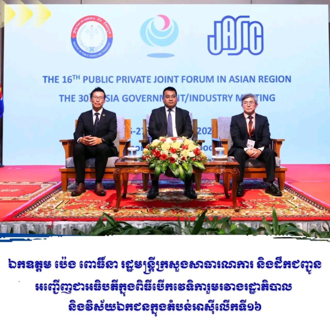 នារសៀលថៃ្ងអង្គារ ទី២៥ ខែវិច្ឆិកា ឆ្នាំ២០២៥ ឯកឧត្តម ប៉េង ពោធិ៍នា រដ្ឋមន្ត្រីក្រសួងសាធារណការ និងដឹកជញ្ជូន បានអញ្ជើញជាអធិបតីក្នុងពិធីបើកវេទិការួមរវាងរដ្ឋាភិបាល និងវិស័យឯកជនក្នុងតំបន់អាស៊ីលើកទី១៦ ដោយមានការចូលរួមពី ឯកឧត្តម លោកជំទាវ ថ្នាក់ដឹកនាំក្រសួង ស្ថាប័នរដ្ឋពាក់ព័ន្ធ អង្គការ JASIC (Japan Automobile Standards Internationalization Center) និងឯកជនអន្តរជាតិជាច្រើនប្រទេសចូលរួម។
