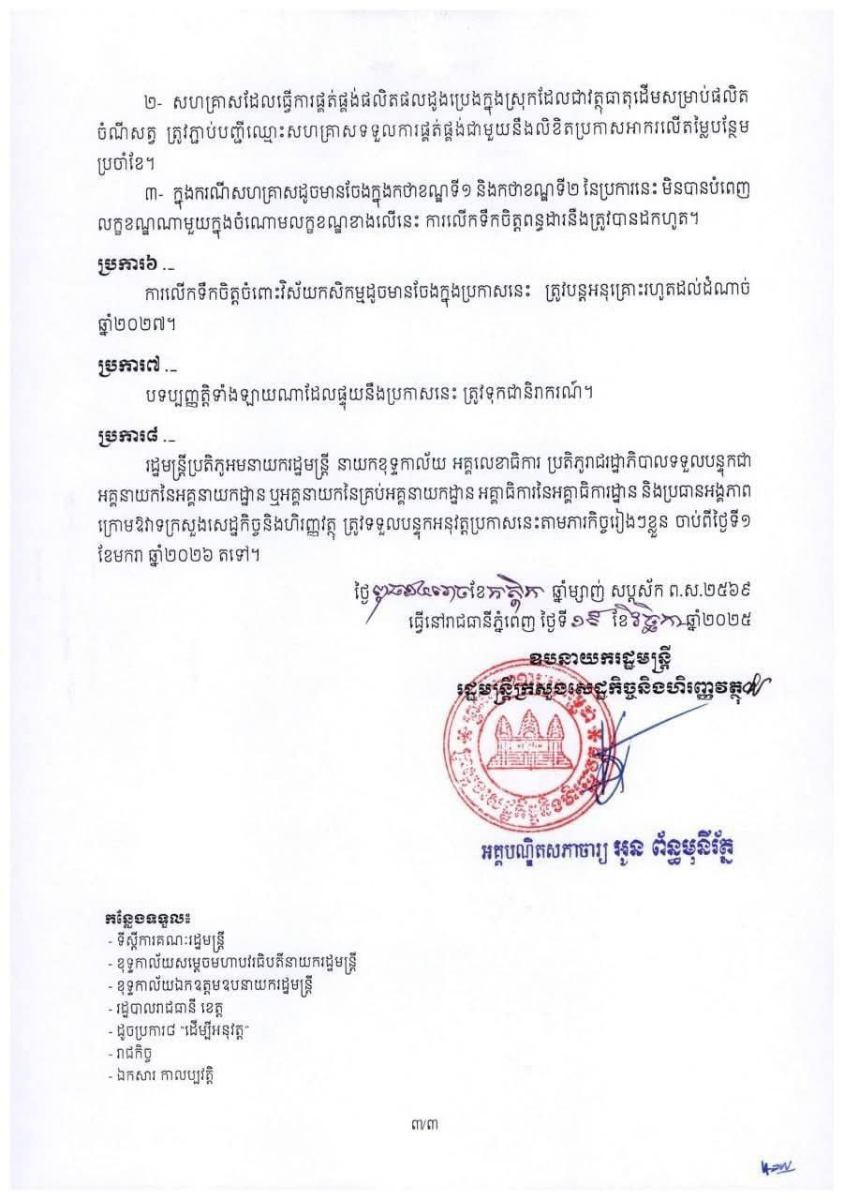 ក្រសួងសេដ្ឋកិច្ច និងហិរញ្ញវត្ថុ នៅថ្ងៃទី១៩ ខែវិច្ឆិកា ឆ្នាំ២០២៥ នេះ ចេញប្រកាស ស្តីពីការលើកទឹកចិត្តពន្ធដារចំពោះវិស័យ កសិកម្ម ដោយប្រកាសនេះមានវិសាលភាពអនុវត្តចំពោះការដាំដុះ ការផលិត ការផ្គត់ផ្គង់ក្នុងស្រុក ឬការនាំចេញ ស្រូវ អង្ករ ពោត សណ្តែក ម្រេច ដំឡូងមី គ្រាប់ស្វាយចន្ទី ជ័រកៅស៊ូ មៀនប៉ៃលិន ស្វាយ ចេក ការចិញ្ចឹមសត្វ វារីវប្បកម្ម និងផលិតផលដូងប្រេងក្នុង ស្រុក ដែលជាវត្ថុធាតុដើមសម្រាប់ផលិតចំណីសត្វ ត្រូវបានចាត់ទុកជាបន្ទុករបស់រដ្ឋនូវអាករលើតម្លៃបន្ថែម ចំពោះការផ្គត់ផ្គង់ក្នុងស្រុក នូវទំនិញ ឬសេវាដល់សហគ្រាសដែលធ្វើការដាំដុះ ផលិត ផ្គត់ផ្គង់ក្នុងស្រុកដូចខាងលើ និងរួមជាមួយការផ្គត់ផ្គង់ផលិតផលដូងប្រេង ក្នុងស្រុក ដែលជាវត្ថុធាតុដើមសម្រាប់ផលិតចំណីសត្វ។ វិធានការនេះ មិនត្រូវគិតអាករលើតម្លៃបន្ថែមលើការផ្គត់ផ្គង់របស់ខ្លួនទេ ប៉ុន្តែ ត្រូវបានអនុញ្ញាតឥណទានអាករលើធាតុចូល ដែលទាក់ទិននឹងការផ្គត់ផ្គង់។