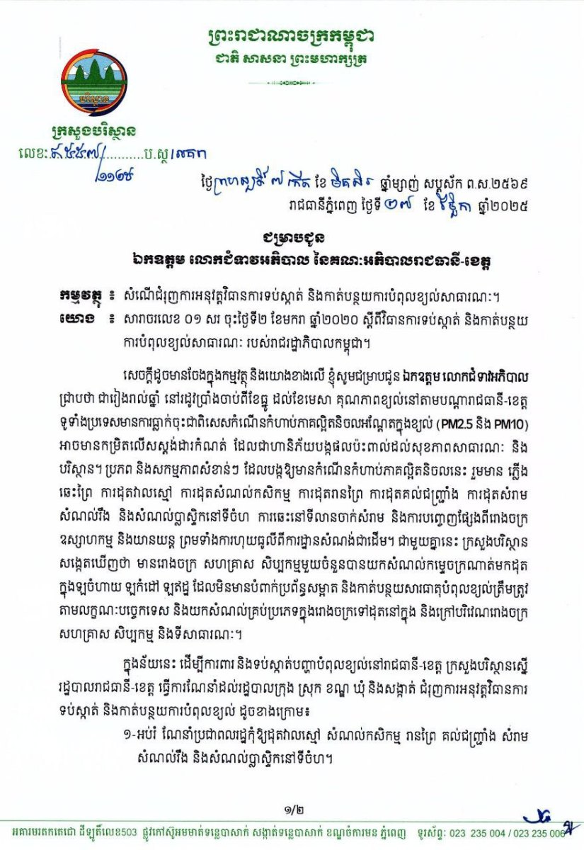 ដើម្បីការពារ និងទប់ស្កាត់បញ្ហាបំពុលខ្យល់នៅកម្ពុជា ក្រសួងបរិស្ថានស្នើ ឯកឧត្តម លោកជំទាវ អភិបាលនៃគណៈអភិបាលរាជធានី ខេត្ត ធ្វើការណែនាំដល់រដ្ឋបាលក្រុង ស្រុក ខណ្ឌ ឃុំ និងសង្កាត់ ជំរុញការអនុវត្តវិធានការទប់ស្កាត់ និងកាត់បន្ថយការបំពុលខ្យល់ ដូចខាងក្រោម៖