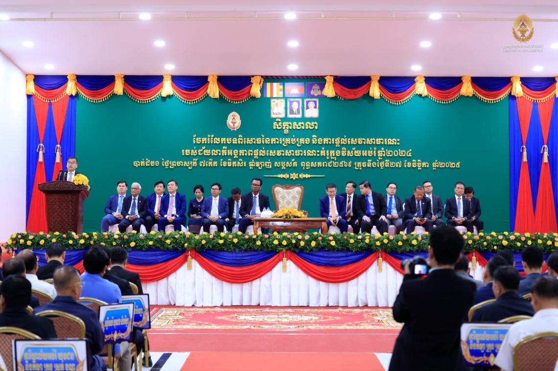 នៅថ្ងៃទី២៧ ខែវិច្ឆិកា ឆ្នាំ២០២៥ ឯកឧត្តម យក់ ប៊ុនណា រដ្ឋលេខាធិការប្រចាំការក្រសួងមុខងារសាធារណៈ តំណាងដ៏ខ្ពង់ខ្ពស់ ឯកឧត្តម ហ៊ុន ម៉ានី ឧបនាយករដ្ឋមន្ត្រី រដ្ឋមន្ត្រីក្រសួងមុខងារសាធារណៈ និងជាប្រធានគណៈកម្មការវាយតម្លៃអង្គភាពផ្តល់សេវាសាធារណៈថ្នាក់ជាតិ (គ.វ.ជ.) បានអញ្ជើញជាអធិបតីក្នុងពិធីបើកសិក្ខាសាលាស្តីពី ការចែករំលែកបទពិសោធនៃការគ្រប់គ្រង និងការផ្តល់សេវាសាធារណៈរបស់ជ័យលាភីអង្គភាពផ្តល់សេវាសាធារណៈគំរូក្នុងវិស័យអប់រំ ឆ្នាំ២០២៤ សម្រាប់កម្រិតវិទ្យាល័យ ដែលប្រព្រឹត្តទៅរយៈពេល ២ថ្ងៃ គឺនៅថ្ងៃទី២៧-២៨ ខែវិច្ឆិកា ឆ្នាំ២០២៥ នៅខេត្តបាត់ដំបង។