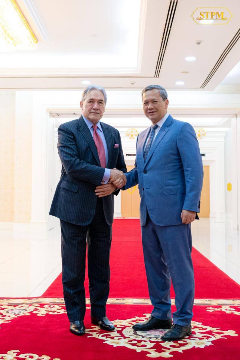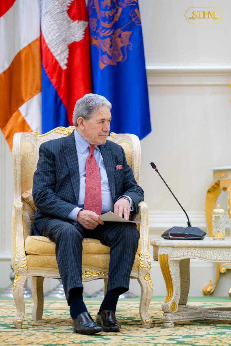 នាព្រឹកថ្ងៃទី២៩ ខែវិច្ឆិកា ឆ្នាំ២០២៥, សម្តេចមហាបវរធិបតី ហ៊ុន ម៉ាណែត នាយករដ្ឋមន្ត្រី នៃព្រះរាជាណាចក្រកម្ពុជា បានអនុញ្ញាតឱ្យ ឯកឧត្តម Winston Peters រដ្ឋមន្ត្រីការបរទេសនូវែលសេឡង់ និង គណៈប្រតិភូចូលជួបសម្ដែងការគួរសម និងពិភាក្សាការងារ នៅវិមានសន្តិភាព។