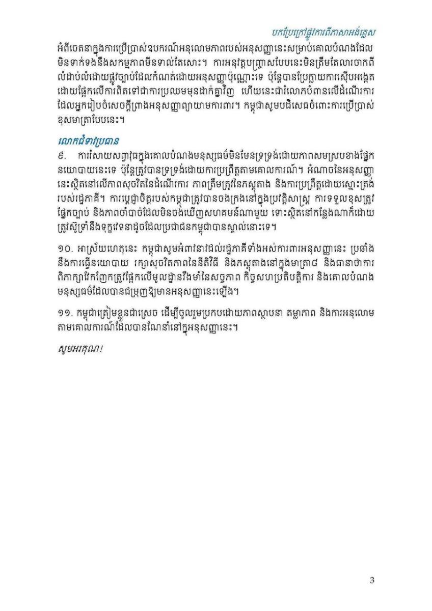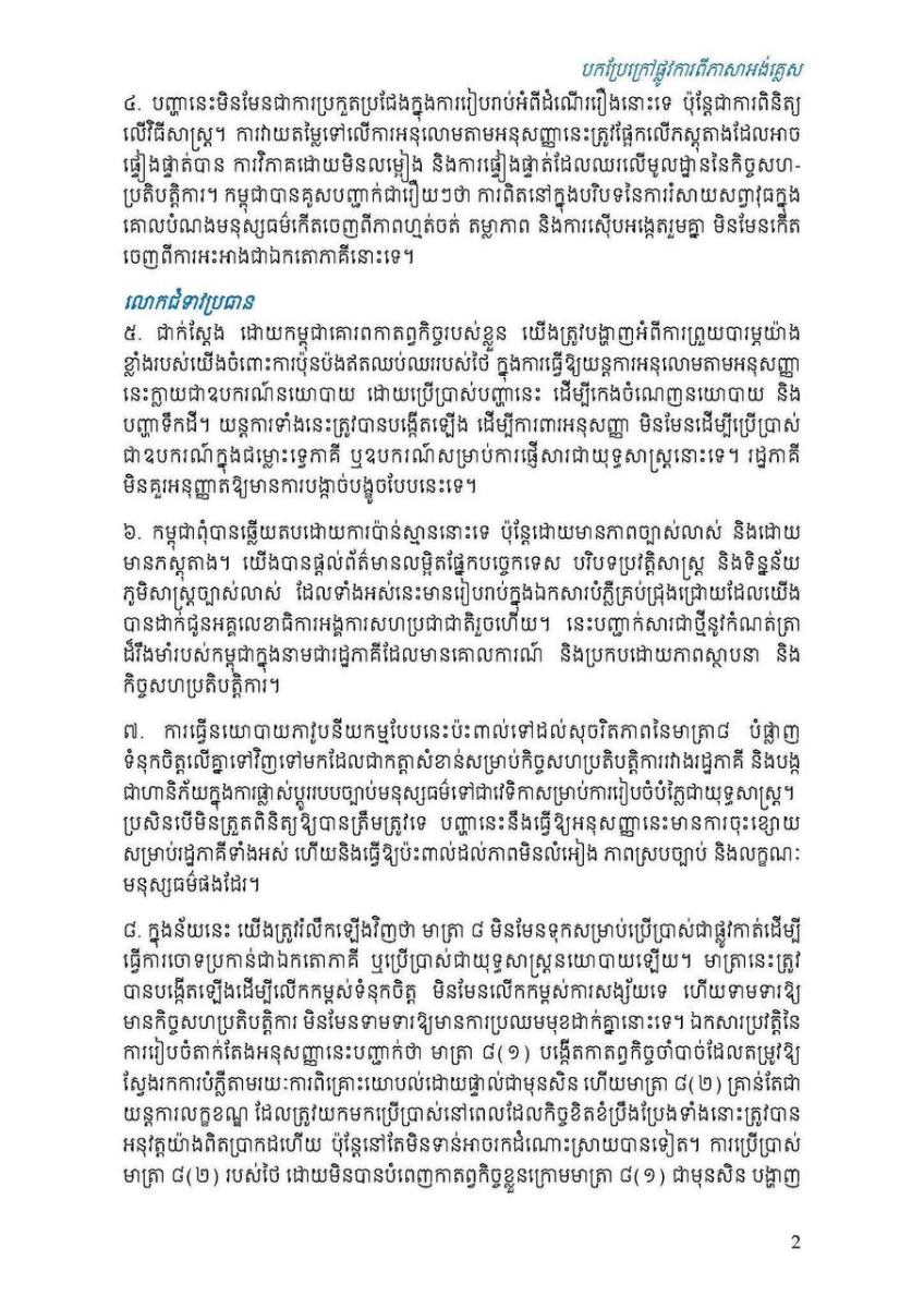 ឯកឧត្តម អ៊ិន តារា បានបន្ថែមទៀតថា ការអនុវត្តបញ្ច្រាស់បែបនេះមិនត្រឹមតែលារចាកពីលំដាប់ លំដោយផ្លូវច្បាប់ ដែលបានកំណត់ដោយអនុសញ្ញាប៉ុណ្ណោះទេ ប៉ុន្តែបានប្រែក្លាយការស៊ើបអង្កេត ដោយ ផ្អែកលើការពិតទៅជាការប្រឈមមុខដាក់គ្នាវិញ ហើយនេះជាការរំលោភបំពានលើដំណើរការ ដែលអ្នក រៀបចំសេចក្តីព្រាងអនុសញ្ញាព្យាយាមការពារ។ យ៉ាងណាក៏ដោយកម្ពុជាសូមធ្វើការបដិសេធចំពោះការប្រើប្រាស់ខុសមាត្រាបែបនេះ៕អត្ថបទបាន ចក់