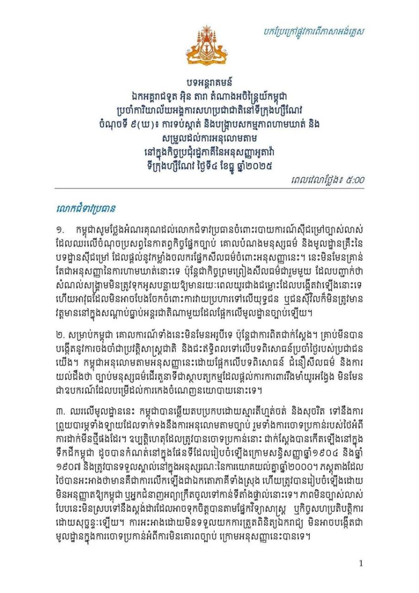 ឯកឧត្តម តំណាងអចិន្រ្តៃយ៍កម្ពុជា ប្រចាំនៅអង្គការសហប្រជាជាតិ បានសង្កត់ធ្ងន់ថា«ឧប្បត្តិហេតុ ដែលត្រូវបានចោទប្រកាន់នោះ ជាក់ស្តែងបានកើតឡើងនៅក្នុងទឹកដីកម្ពុជា ដូចបានកំណត់នៅក្នុង ផែនទីដែលរៀបចំឡើងក្រុមសន្ធិសញ្ញា១៩០៤ និងឆ្នាំ១៩០៧ និងត្រូវបានទទួលស្គាល់នៅក្នុងអនុស្សរណៈនៃការយោគយល់គ្នាឆ្នាំ២០០០។ ភស្តុតាងដែលថៃអះអាងថា មានគឺជាការលើកឡើងជាឯក តោភាគីទាំងស្រុង ហើយត្រូវបានរៀបចំឡើងដោយមិនអនុញ្ញាតឲ្យកម្ពុជា ឬអ្នកជំនាញអព្យាក្រឹតចូលទៅ កាន់ទីតាំងនោះទេ។ ភាពមិនច្បាស់លាស់បែបនេះមិនស្របទៅនឹងស្តង់ដារដែលអាចទុកចិត្តបានតាម ផ្នែកវិទ្យាសាស្រ្ត ឬកិច្ចសហប្រតិបត្តិការដោយសុឆន្ទៈឡើយ ហើយការអះអាងដោយមិនទទួលយកការ ពិនិត្យឯករាជ្យ មិនអាចបង្កើតជាមូលដ្ឋានក្នុងការចោទប្រកាន់អំពីការមិនគោរពច្បាប់ ក្រោមអនុសញ្ញានេះ បានទេ»។
