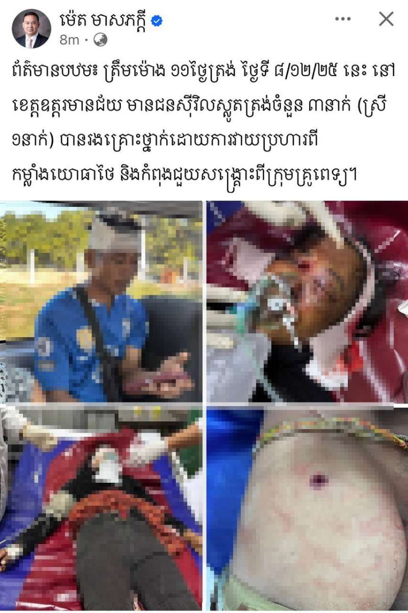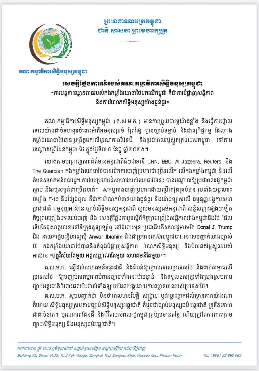 តាមសេចក្ដីថ្លែងការណ៍ គណៈកម្មាធិការសិទ្ធិមនុស្សកម្ពុជា (គ.ស.ម.ក.) មានការព្រួយបារម្ភយ៉ាងខ្លាំង និងធ្វើការថ្កោល ទោសយ៉ាងដាច់អហង្ការចំពោះអំពើអមនុស្សធម៌ ព្រៃផ្សៃ គ្មានច្បាប់ទម្លាប់ និងជាឧក្រិដ្ឋកម្ម ដែលកង កម្លាំងយោធាថៃបានប្រព្រឹត្តមកលើបូរណភាពដែនដី និងប្រជាពលរដ្ឋស្លូតត្រង់របស់កម្ពុជា នៅតាម បណ្តោយព្រំដែនកម្ពុជា-ថៃ ក្នុងថ្ងៃទី៧-៨ ខែធ្នូ ឆ្នាំ២០២៥។