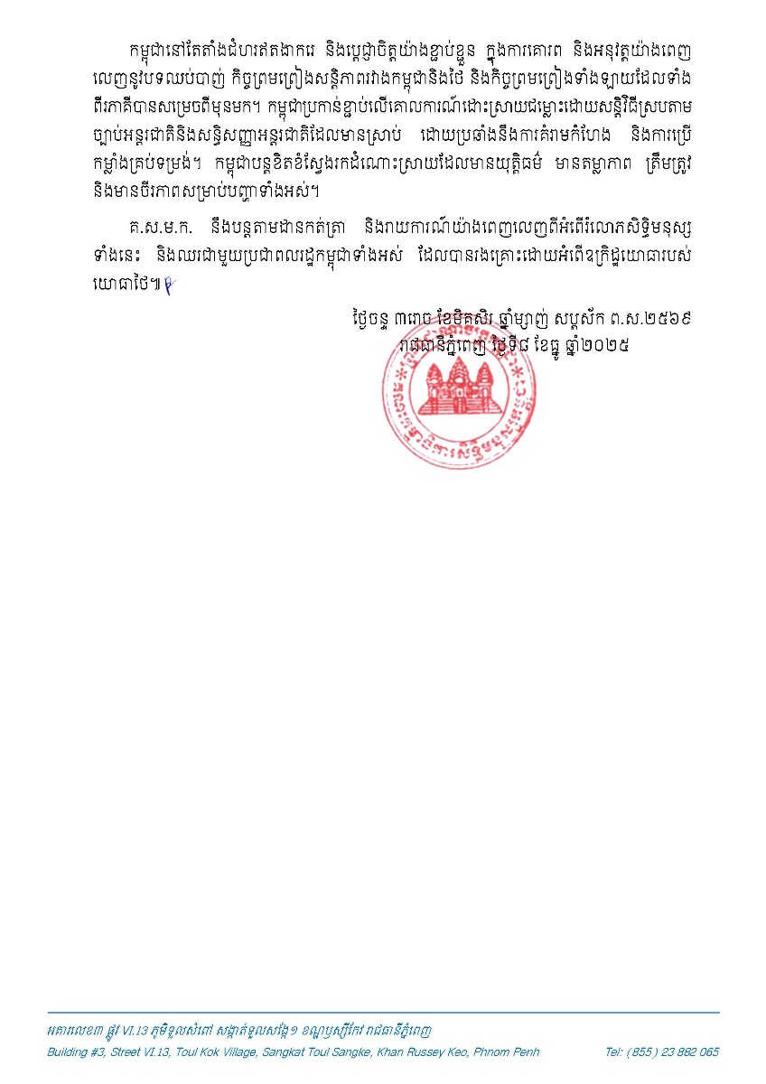 គ.ស.ម.ក. បន្តថា កម្ពុជានៅតែតាំងជំហរឥតងាករេ និងប្តេជ្ញាចិត្តយ៉ាងខ្ជាប់ខ្ជួន ក្នុងការគោរព និងអនុវត្តយ៉ាងពេញ លេញនូវបទឈប់បាញ់ កិច្ចព្រមព្រៀងសន្តិភាពរវាងកម្ពុជានិងថៃ និងកិច្ចព្រមព្រៀងទាំងឡាយដែលទាំង ពីរភាគីបានសម្រេចពីមុនមក។ កម្ពុជាប្រកាន់ខ្ជាប់លើគោលការណ៍ដោះស្រាយជម្លោះដោយសន្តិវិធីស្របតាម ច្បាប់អន្តរជាតិនិងសន្ធិសញ្ញាអន្តរជាតិដែលមានស្រាប់ ដោយប្រឆាំងនឹងការគំរាមកំហែង និងការប្រើ កម្លាំងគ្រប់ទម្រង់។ កម្ពុជាបន្តខិតខំស្វែងរកដំណោះស្រាយដែលមានយុត្តិធម៌ មានតម្លាភាព ត្រឹមត្រូវ និងមានចីរភាពសម្រាប់បញ្ហាទាំងអស់។
