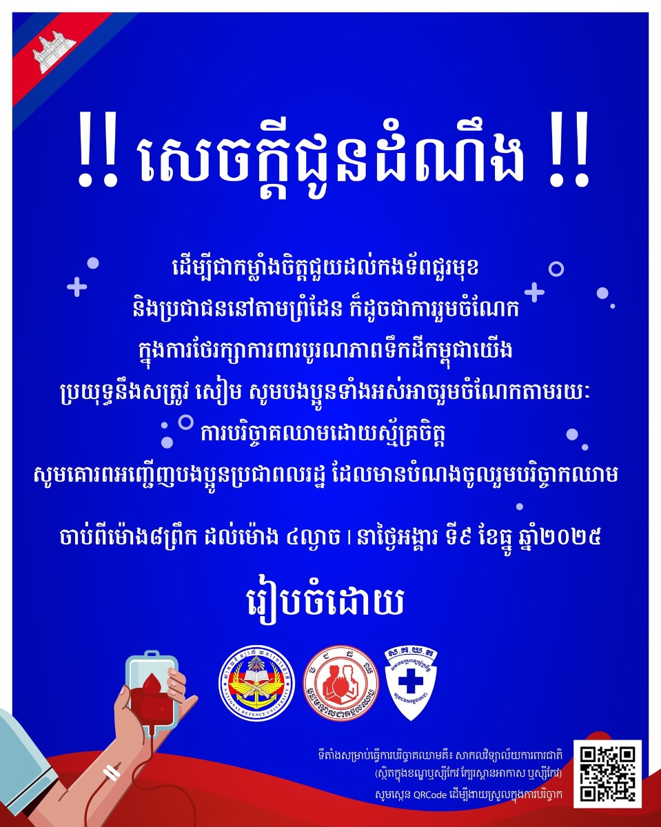 សេចក្ដីជូនដំណឹងបន្តទៀតថា សូមបងប្អូនទាំងអស់អាចរួមចំណែកតាមរយៈការបរិច្ចាគឈាមដោយស្ម័គ្រចិត្ត សូមគោរពអញ្ជើញបងប្អូនប្រជាពលរដ្ឋ ដែលមានបំណងចូលរួមបរិច្ចាកឈាម ទាំងអស់គ្នា នាថ្ងៃអង្គារ ទី៩ ខែធ្នូ ឆ្នាំ២០២៥ ចាប់ពីម៉ោង៨ព្រឹក ដល់ម៉ោង ៤ល្ងាច។ ចំពោះ ទីតាំងសម្រាប់ធ្វើការបរិច្ចាគឈាមគឺ៖ សាកលវិទ្យាល័យការពារជាតិ ស្ថិតក្នុងខណ្ឌឫស្សីកែវ ក្បែរស្ពានអាកាស ឫស្សីកែវ ឬអាចទំនាក់ទំងលេខទូរសព្ទ 098 884 808, 061 300 080៕