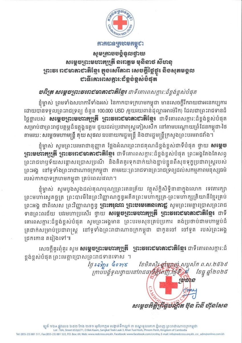 សម្តេចព្រះមហាក្សត្រី នរោត្តម មុនិនាថ សីហនុ ព្រះវររាជមាតាជាតិខ្មែរ ព្រះប្រធានកិត្តិយសកាកបាទក្រហមកម្ពុជា ជាទីគោរពសក្ការៈដ៏ខ្ពង់ខ្ពស់បំផុត បានសព្វព្រះរាជហឫទ័យប្រោសព្រះរាជទាននូវព្រះរាជទ្រព្យចំនួន ១០០.០០០ដុល្លារ (ដប់ម៉ឺនដុល្លារអាមេរិក) ជូនសម្តេចកិត្តិព្រឹទ្ធបណ្ឌិត ប៊ុន រ៉ានី ហ៊ុនសែន ប្រធានកាកបាទក្រហមកម្ពុជា ដើម្បីជួយដល់ប្រជារាស្ត្រភៀសសឹក នៅតាមបណ្តោយព្រំដែនកម្ពុជា-ថៃ។