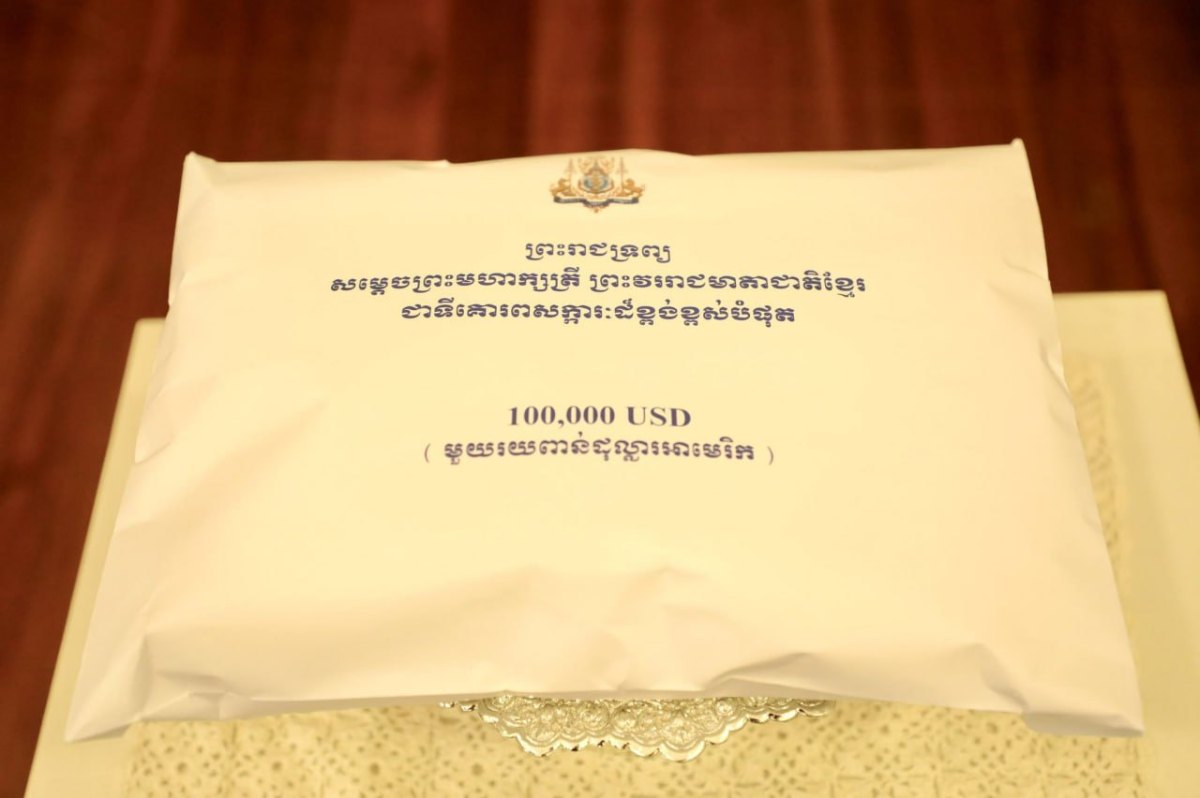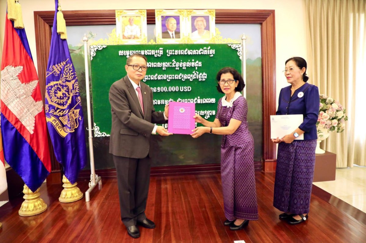 ព្រះរាជទ្រព្យដ៏ឧត្តុង្គឧត្តមខាងលើនេះត្រូវបាន សម្តេចមហាមន្ត្រី គុយ សុផល ឧបនាយករដ្ឋមន្ត្រី និងជារដ្ឋមន្ត្រីក្រសួងព្រះបរមរាជវាំង ប្រគល់ជូនលោកជំទាវ ពុំ ចន្ទីនី កាកបាទក្រហមកម្ពុជា តំណាងដ៏ខ្ពង់ខ្ពស់សម្តេចកិត្តិព្រឹទ្ធបណ្ឌិត ប៊ុន រ៉ានី ហ៊ុនសែន ប្រធានកាកបាទក្រហមកម្ពុជា នៅសាលប្រជុំក្រសួងព្រះបរមរាជវាំង នាព្រឹកថ្ងៃអង្គារ ទី៩ ខែធ្នូ ឆ្នាំ២០២៥នេះ។