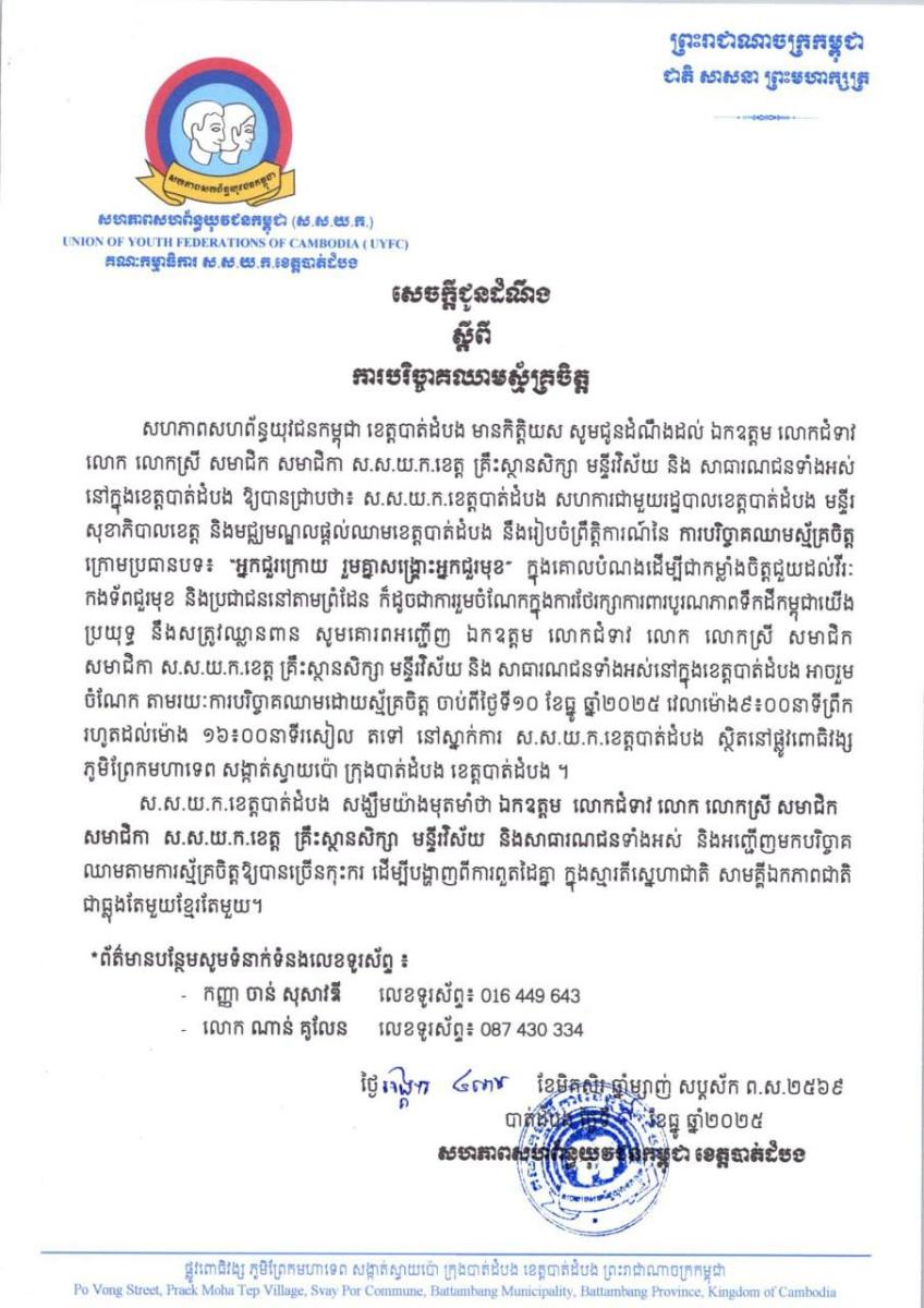 តាមរយៈសេចក្តីជូនដំណឹងនៅថ្ងៃទី៩ ខែធ្នូ ឆ្នាំ២០២៥នេះ សហភាពសហព័ន្ធយុវជនកម្ពុជាខេត្តបាត់ដំបង បានអំពាវនាវដល់សមាជិក សមាជិកា ស.ស.យ.ក.ខេត្ត គ្រឹះស្ថានសិក្សា មន្ទីរវិស័យ និង សាធារណជនទាំងអស់នៅក្នុងខេត្តបាត់ដំបងអាចរួមចំណែកតាមរយៈការបរិច្ចាគឈាមដោយស្ម័គ្រចិត្តចាប់ពីថ្ងៃទី១០ ខែធ្នូ ឆ្នាំ២០២៥ វេលាម៉ោង៩៖០០នាទីព្រឹក រហូតដល់ម៉ោង ១៦៖០០នាទីរសៀល តទៅ នៅស្នាក់ការ ស.ស.យ.ក.ខេត្តបាត់ដំបង ស្ថិតនៅផ្លូវពោធិ៍វង្ស ភូមិព្រែកមហាទេព សង្កាត់ស្វាយប៉ោ ក្រុងបាត់ដំបង ខេត្តបាត់ដំបង។