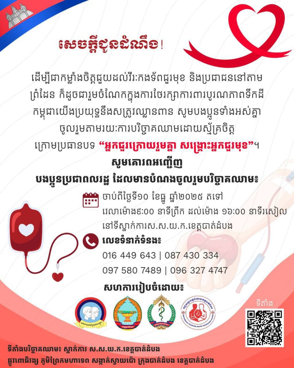 បាត់ដំបង៖ស.ស.យ.ក.ខេត្តបាត់ដំបង សហការជាមួយរដ្ឋបាលខេត្តបាត់ដំបង មន្ទីរសុខាភិបាលខេត្ត និងមជ្ឈមណ្ឌលផ្តល់ឈាមខេត្តបាត់ដំបង នឹងរៀបចំព្រឹត្តិការណ៍នៃការបរិច្ចាគឈាមស្ម័គ្រចិត្ត ក្រោមប្រធានបទ៖ “អ្នកជួរក្រោយ រួមគ្នាសង្គ្រោះអ្នកជួរមុខ ក្នុងគោលបំណងដើម្បីជាកម្លាំងចិត្តជួយដល់វីរៈកងទ័ពជួរមុខ និងប្រជាជននៅតាមព្រំដែន ក៏ដូចជាការរួមចំណែកក្នុងការថែរក្សាការពារបូរណភាពទឹកដីកម្ពុជាយើងប្រយុទ្ធ នឹងសត្រូវឈ្លានពាន។