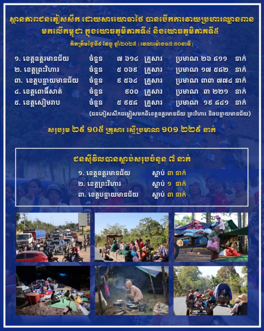 គិតមកដល់ព្រឹកថ្ងៃទី៩ ខែធ្នូ ឆ្នាំ២០២៥នេះ អំពើឈ្លានពានរបស់ភាគីថៃលើដែនអធិបតេយ្យកម្ពុជា ដែលផ្តើមឡើងជាថ្មីទៀតចាប់ពីថ្ងៃទី៧ ខែធ្នូមកនោះបានបណ្តាលឱ្យប៉ះពាល់យ៉ាងខ្លាំងដល់តំបន់ស៊ីវិលជាច្រើនកន្លែង ប្រជាពលរដ្ឋខ្មែរស្លាប់ របួស បង្ខំចិត្តជម្លៀស បំផ្លិចបំផ្លាញហេដ្ឋារចនាសម្ព័ន្ធ វត្តអារាម សម្បត្តិវប្បធម៌ បេតិកភណ្ឌមនុស្សជាតិ និងបង្អាក់សេវាសាធារណៈជាមូលដ្ឋាននានា។