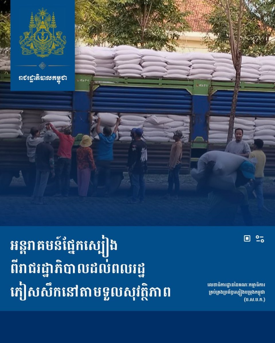 លេខាធិការដ្ឋាននៃគណៈកម្មាធិការ គ្រប់គ្រងប្រព័ន្ធស្បៀងបម្រុងកម្ពុជា (ប.ស.ប.ក.) បានឱ្យដឹងថា ចាប់តាំងពីថ្ងៃទី៨ដល់១០ ខែធ្នូ ឆ្នាំ២០២៥នេះ រាជរដ្ឋាភិបាលបានបញ្ចេញកញ្ចប់ស្បៀងជួយពលរដ្ឋ ភៀសសឹកជាបន្ទាន់ ទៅខេត្តព្រះវិហារ ឧត្តរមានជ័យ បន្ទាយមានជ័យ និងពោធិ៍សាត់ ស្របតាមការស្នើរបស់ខេត្ត ទាំង ៤នេះ ដែលរួមមាន៖