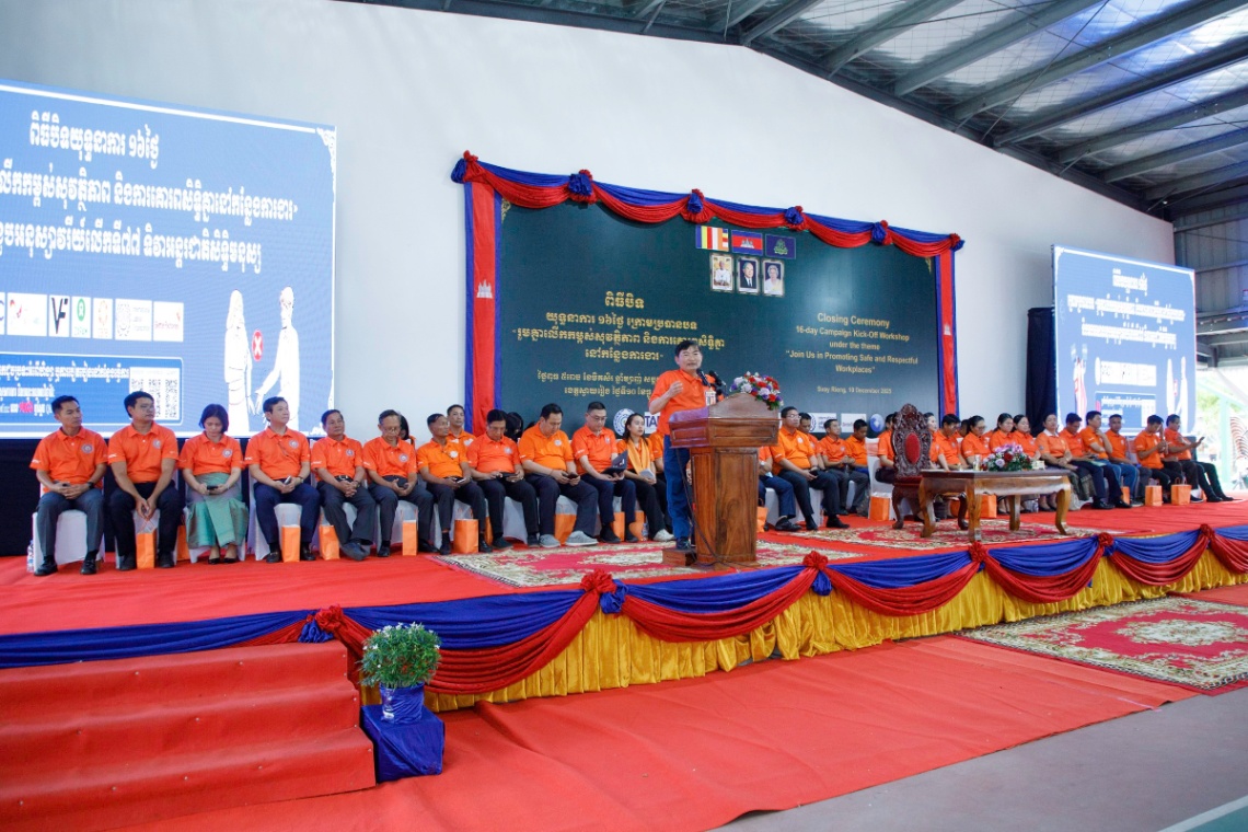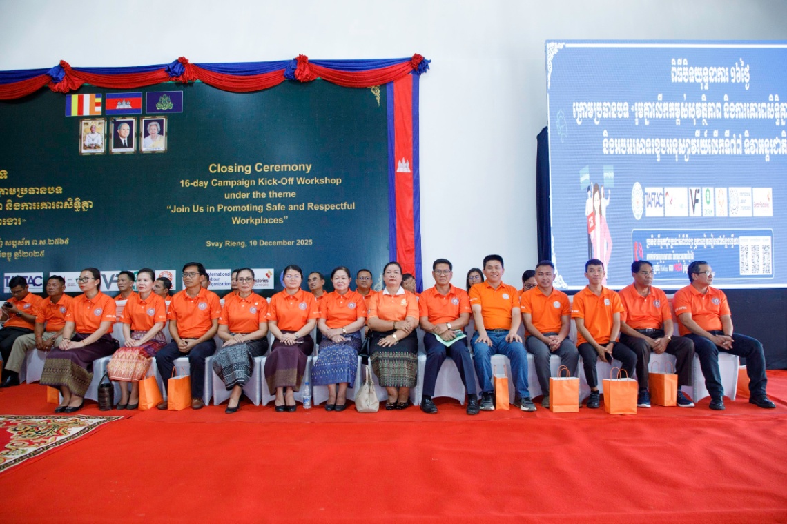ឯកឧត្តម ហេង សួរ រដ្ឋមន្រ្តីក្រសួងការងារ និងបណ្តុះបណ្តាលវិជ្ជាជីវៈ បានអញ្ជើញជាអធិបតីក្នុងពិធីបិទយុទ្ធនាការ ១៦ថ្ងៃ ប្រឆាំងអំពើហិង្សាផ្អែកលើយេនឌ័រ ក្រោមប្រធានបទ «រួមគ្នាលើកកម្ពស់សុវត្ថិភាព និងការគោរពសិទ្ធិគ្នានៅកន្លែងការងារ» និងអបអរសាទរ ខួបអនុស្សាវរីយ៍លើកទី៧៧ នៃទិវាអន្តរជាតិសិទ្ធិមនុស្ស ដែលត្រូវបានរៀបចំឡើងនារសៀលថ្ងៃទី១០ ខែធ្នូ ឆ្នាំ២០២៥ នៅតំបន់សេដ្ឋកិច្ចពិសេសស្វាយរៀង ហ្គីហ្គា រីសស៍ ខេត្តស្វាយរៀង ដោយមានការចូលរួមពី អាជ្ញាធរខេត្តស្វាយរៀង ថ្នាក់ដឹកនាំក្រសួង និងតំណាងក្រសួង ស្ថាប័ននានា រួមជាមួយអង្គការជាតិ អន្តរជាតិជាដៃគូពាក់ព័ន្ធ សរុបប្រមាណ ១ ៤០០នាក់ បានចូលរួមក្នុងពិធីនេះ។
