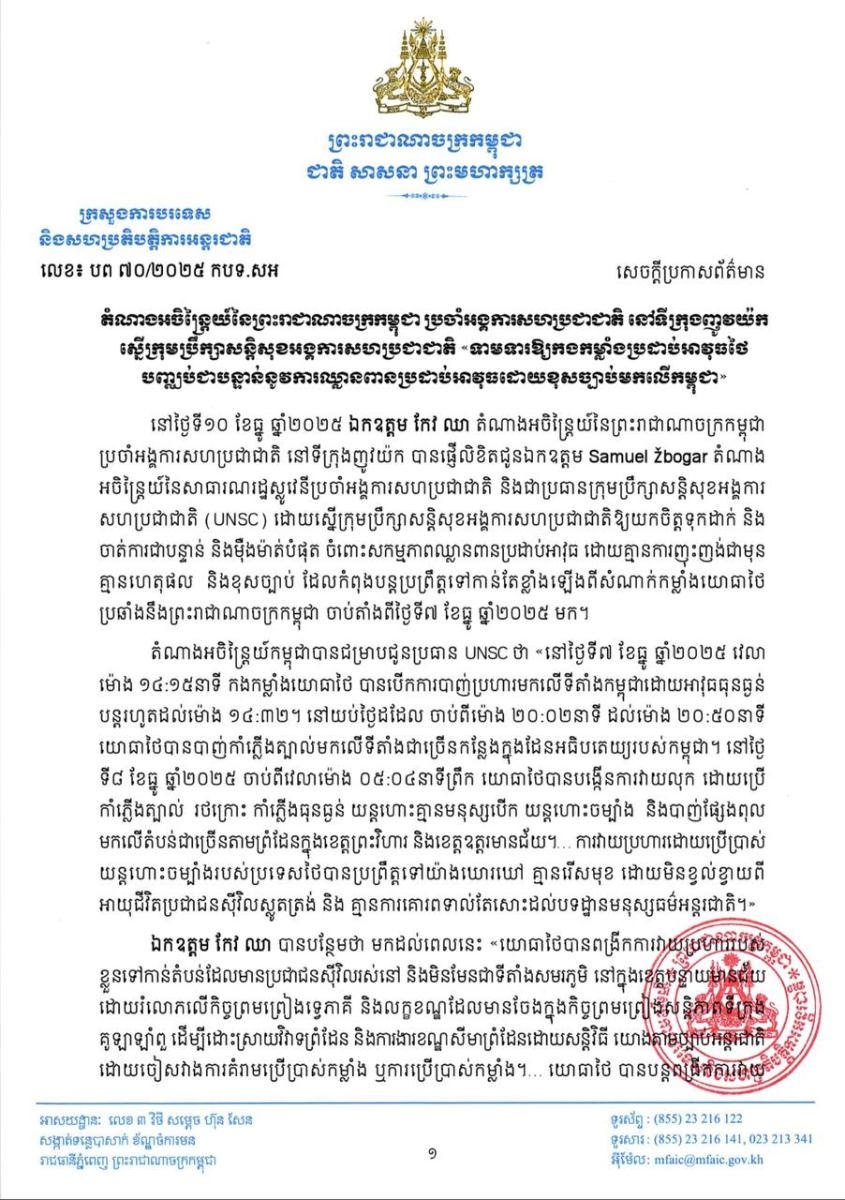 សេចក្តីប្រកាសព័ត៌មាន បានឱ្យដឹងថា នៅថ្ងៃទី១០ ខែធ្នូ ឆ្នាំ២០២៥ ឯកឧត្ដម កែវ ឈា តំណាងអចិន្ត្រៃយ៍នៃព្រះរាជាណាចក្រកម្ពុជា ប្រចាំអង្គការសហប្រជាជាតិ នៅទីក្រុងញូវយ៉ក បានផ្ញើលិខិតជូនឯកឧត្តម Samuel Zbogar តំណាង អចិន្ត្រៃយ៍នៃសាធារណរដ្ឋស្លូវេនីប្រចាំអង្គការសហប្រជាជាតិ និងជាប្រធានក្រុមប្រឹក្សាសន្តិសុខអង្គការ សហប្រជាជាតិ (UNSC) ដោយស្នើក្រុមប្រឹក្សាសន្តិសុខអង្គការសហប្រជាជាតិឱ្យយកចិត្តទុកដាក់ និងចាត់ការជាបន្ទាន់ និងម៉ឺងម៉ាត់បំផុត ចំពោះសកម្មភាពឈ្លានពានប្រដាប់អាវុធ ដោយគ្មានការញុះញង់ជាមុន គ្មានហេតុផល និងខុសច្បាប់ ដែលកំពុងបន្តប្រព្រឹត្តទៅកាន់តែខ្លាំងឡើងពីសំណាក់កម្លាំងយោធាថៃ ប្រឆាំងនឹងព្រះរាជាណាចក្រកម្ពុជា ចាប់តាំងពីថ្ងៃទី៧ ខែធ្នូ ឆ្នាំ២០២៥ មក។