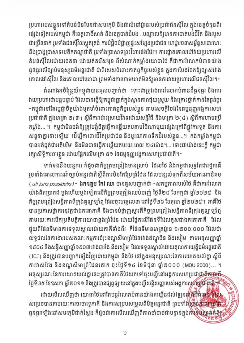 ២. «ទាមទារឱ្យបញ្ឈប់ជាបន្ទាន់នូវការវាយប្រហារដោយយោធាថៃ រួមទាំងការបាញ់ផ្លោងដោយ កាំភ្លើងធំ និងប្រតិបត្តិការយន្តហោះចម្បាំង ដែលរំលោភអធិបតេយ្យ និងបូរណភាពទឹកដី របស់កម្ពុជា។»