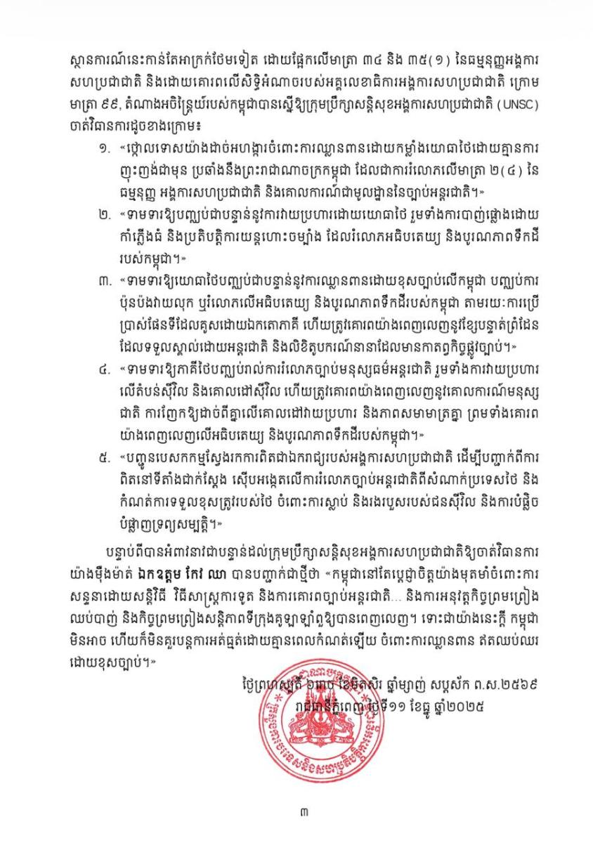 ៣. «ទាមទារឱ្យយោធាថៃបញ្ឈប់ជាបន្ទាន់នូវការឈ្លានពានដោយខុសច្បាប់លើកម្ពុជា បញ្ឈប់ការប៉ុនប៉ងវាយលុក ឬរំលោភលើអធិបតេយ្យ និងបូរណភាពទឹកដីរបស់កម្ពុជា តាមរយៈការបើប្រាស់ផែនទីដែលគូសដោយឯកតោភាគី ហើយត្រូវគោរពយ៉ាងពេញលេញនូវខ្សែបន្ទាត់ព្រំដែន ដែលទទួលស្គាល់ដោយអន្តរជាតិ និងលិខិតូបករណ៍នានាដែលមានកាតព្វកិច្ចផ្លូវច្បាប់។»