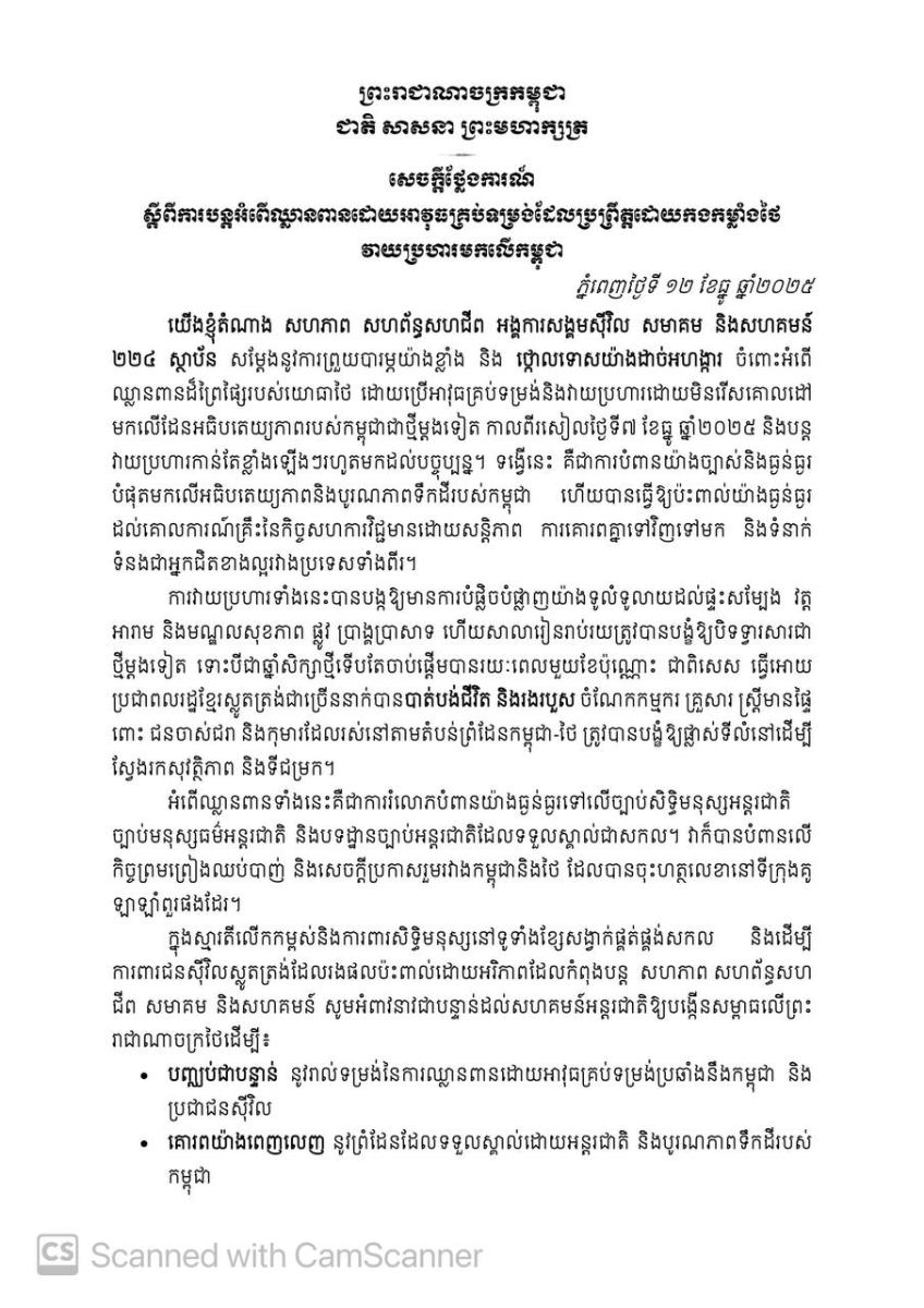 ស្ថាប័នទាំងអស់ សម្តែងនូវការព្រួយបារម្ភយ៉ាងខ្លាំង និង ថ្កោលទោសយ៉ាងដាច់អហង្ការ ចំពោះអំពើ ឈ្លានពានដ៏ព្រៃផ្សៃរបស់យោធាថៃ ដោយប្រើអាវុធគ្រប់ទម្រង់និងវាយប្រហារដោយមិនរើសគោលដៅ មកលើដែនអធិបតេយ្យភាពរបស់កម្ពុជាជាថ្មីម្តងទៀត កាលពីរសៀលថ្ងៃទី៧ ខែធ្នូ ឆ្នាំ២០២៥ និងបន្តវាយប្រហារកាន់តែខ្លាំងឡើងៗរហូតមកដល់បច្ចុប្បន្ន។ ទង្វើនេះ គឺជាការបំពានយ៉ាងច្បាស់និងធ្ងន់ធ្ងរ បំផុតមកលើអធិបតេយ្យភាពនិងបូរណភាពទឹកដីរបស់កម្ពុជា ហើយបានធ្វើឱ្យប៉ះពាល់យ៉ាងធ្ងន់ធ្ងរ ដល់គោលការណ៍គ្រឹះនៃកិច្ចសហការវិជ្ជមានដោយសន្តិភាព ការគោរពគ្នាទៅវិញទៅមក និងទំនាក់ទំនងជាអ្នកជិតខាងល្អរវាងប្រទេសទាំងពីរ។