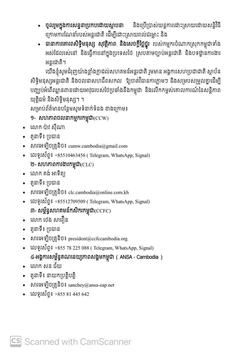 ក្នុងស្មារតីលើកកម្ពស់ និងការពារសិទ្ធិមនុស្សនៅទូទាំងខ្សែសង្វាក់ផ្គត់ផ្គង់សកល និងដើម្បី ការពារជនស៊ីវិលស្លូតត្រង់ដែលរងផលប៉ះពាល់ដោយអរិភាពដែលកំពុងបន្ត សហភាព សហព័ន្ធសហជីព សមាគម និងសហគមន៍ សូមអំពាវនាវជាបន្ទាន់ដល់សហគមន៍អន្តរជាតិឱ្យបង្កើនសម្ពាធលើព្រះរាជាណាចក្រថៃដើម្បី៖