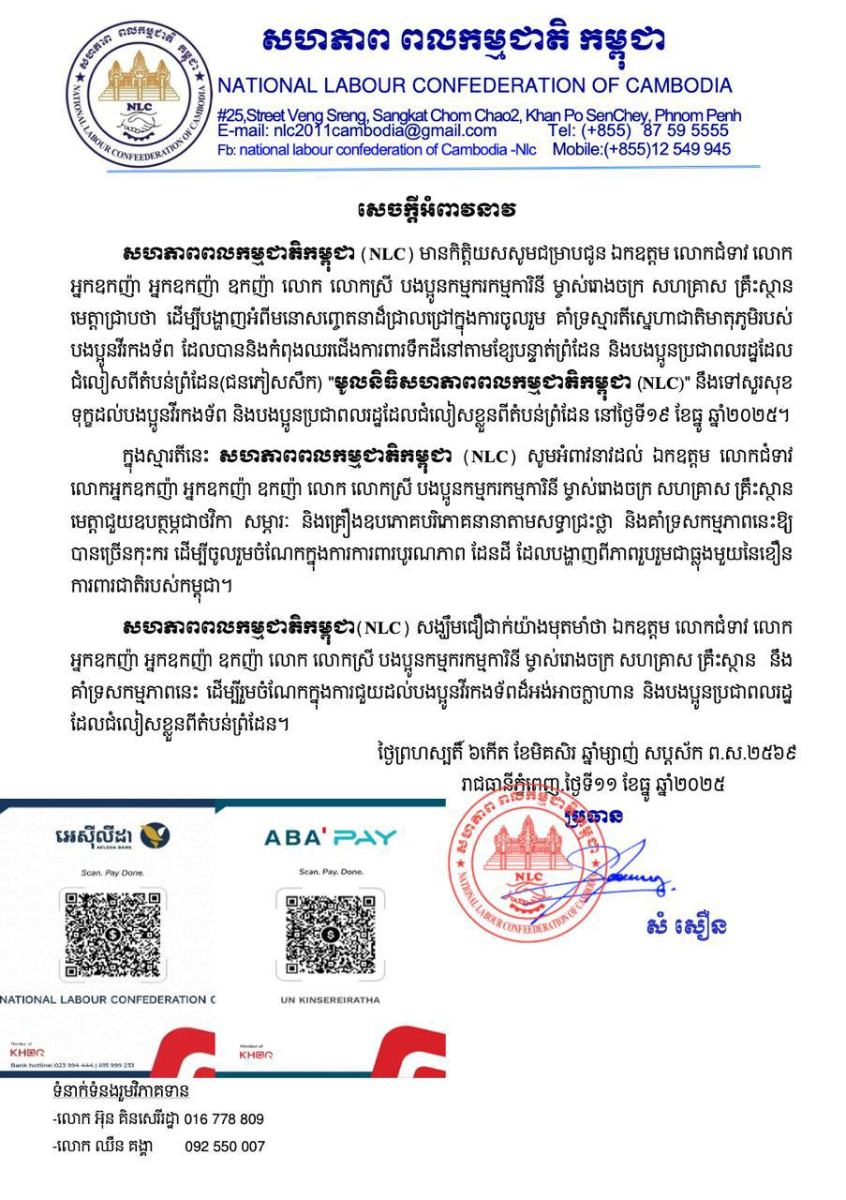 សេចក្ដីអំពាវនាវរបស់សហភាពពលកម្មជាតិកម្ពុជា នៅថ្ងៃទី១១ ខែធ្នូ បានឱ្យដឹងថា ដើម្បីបង្ហាញអំពីមនោសញ្ចេតនាដ៏ជ្រាលជ្រៅ ក្នុងការចូលរួមគាំទ្រស្មារតីស្នេហាជាតិមាតុភូមិ របស់បងប្អូនវីរកងទ័ពកម្ពុជា ដែលបាននិងកំពុងឈរជើងការពារទឹកដី នៅតាមខ្សែបន្ទាត់ព្រំដែន និងបងប្អូនប្រជាពលរដ្ឋដែលជម្លៀសពីតំបន់ព្រំដែន (ជនភៀសសឹក) “មូលនិធិសហភាពពលកម្មជាតិកម្ពុជា (NLC)” នឹងចុះទៅសួរសុខទុក្ខដល់បងប្អូនវីរកងទ័ព និងបងប្អូនប្រជាពលរដ្ឋដែលជម្លៀសខ្លួនចេញពីតំបន់ព្រំដែន នៅថ្ងៃទី១៩ ខែធ្នូ ឆ្នាំ២០២៥ខាងមុខ។