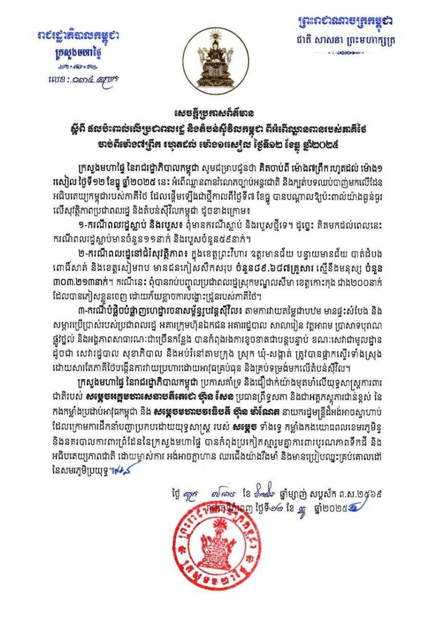 ក្រសួងមហាផ្ទៃ នៃរាជរដ្ឋាភិបាលកម្ពុជា បានចេញ សេចក្តីប្រកាសព័ត៍មាន ឱ្យដឹងថា គិតចាប់ពី ម៉ោង៧ព្រឹក រហូតដល់ ម៉ោង១ រសៀល ថ្ងៃទី១២ ខែធ្នូ ឆ្នាំ២០២៥ នេះ អំពើឈ្លានពានរំលោភច្បាប់អន្តរជាតិ និងក្បត់បទឈប់បាញ់មកលើដែន អធិបតេយ្យកម្ពុជារបស់ភាគីថៃ ដែលផ្តើមឡើងជាថ្មី កាលពីថ្ងៃទី៧ ខែធ្នូ បានបណ្តាលឱ្យប៉ះពាល់យ៉ាងធ្ងន់ធ្ងរ លើសុវត្ថិភាពប្រជាពលរដ្ឋ និងតំបន់ស៊ីវិលកម្ពុជា ដូចខាងក្រោម៖
