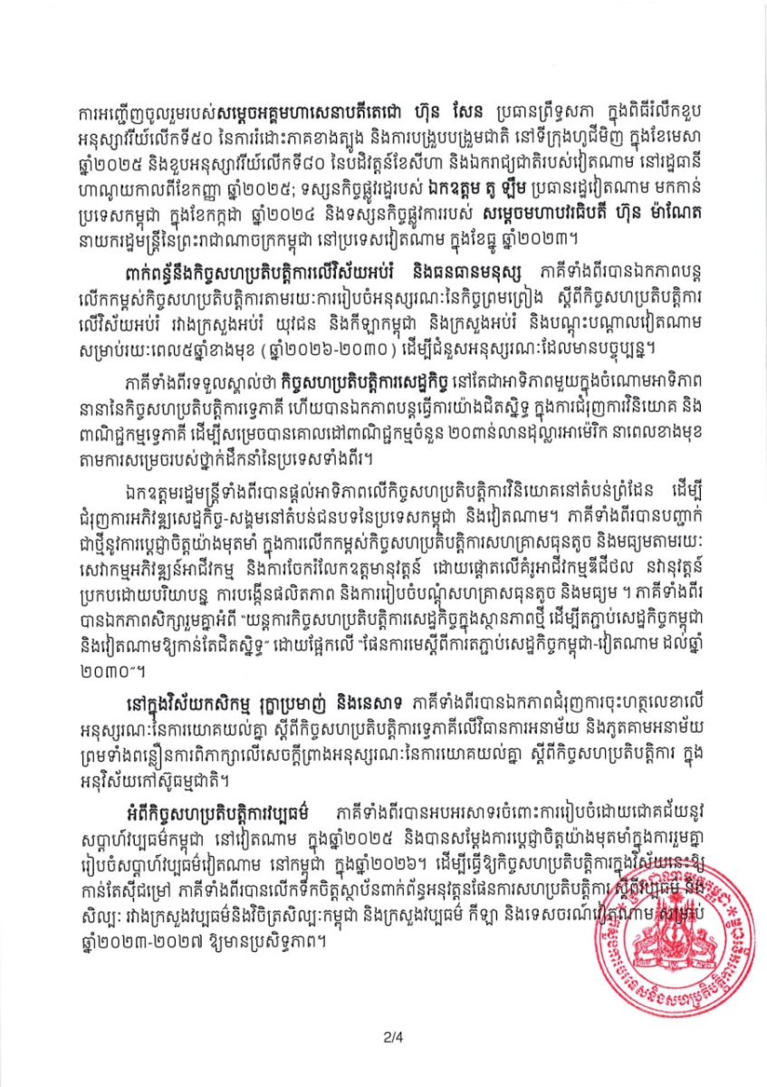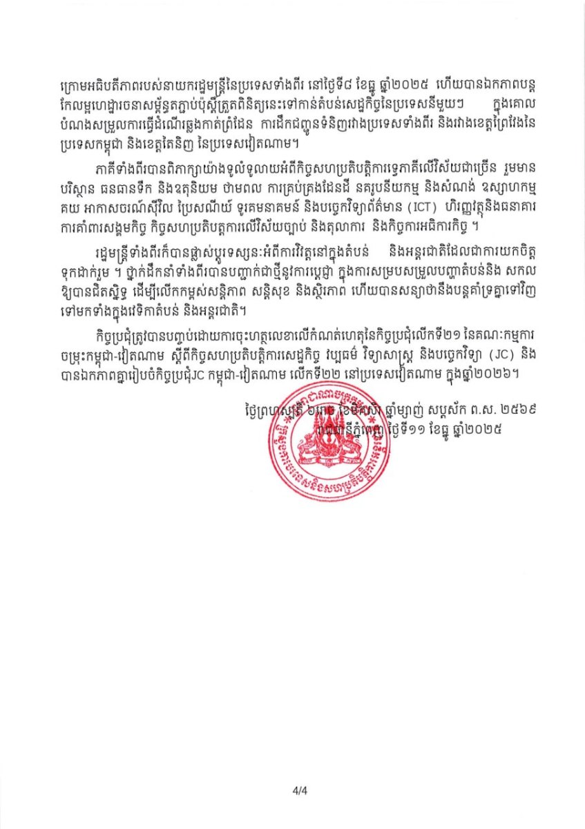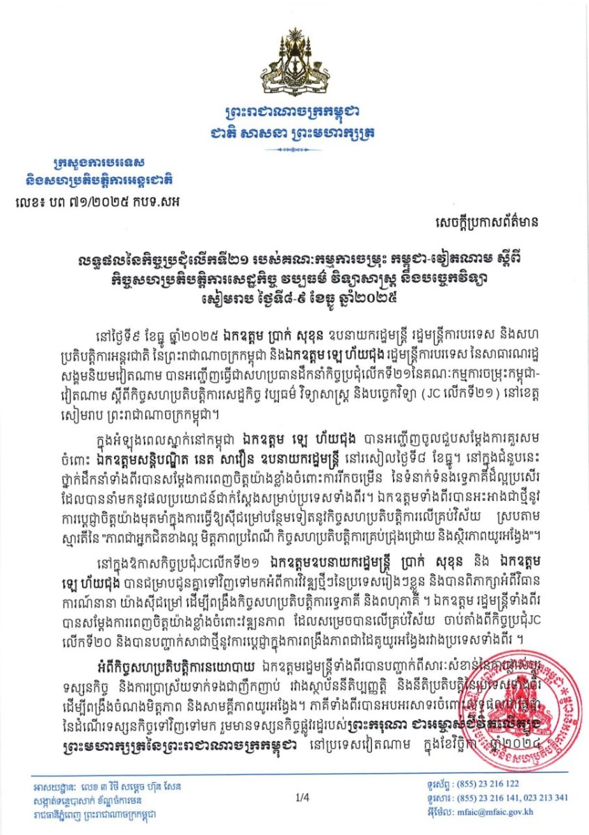 ក្រសួងការបរទេស និងសហប្រតិបត្តិការអន្តរជាតិ នៅថ្ងៃទី១៥ ខែធ្នូ ឆ្នាំ២០២៥ នេះ បានចេញ សេចក្តីប្រកាសព័ត៌មាន ចុះថ្ងៃទី១១ ខែធ្នូ ឆ្នាំ២០២៥ ស្ដីពី លទ្ធផលនៃកិច្ចប្រជុំលើកទី២១ របស់គណៈកម្មការចម្រុះ កម្ពុជា-វៀតណាម ស្តីពី កិច្ចសហប្រតិបត្តិការសេដ្ឋកិច្ច វប្បធម៌ វិទ្យាសាស្ត្រ នឹងបច្ចេកវិទ្យា សៀមរាប ថ្ងៃទី៨-៩ ខែធ្នូ ឆ្នាំ២០២៥។ ក្នុងនោះ ក៏បានបង្ហាញថា កម្ពុជា-វៀតណាម បានឯកភាពជំរុញកិច្ចសហប្រតិបត្តិការ និងពង្រឹងទំនាក់ទំនងរវាងកងទ័ពនៃប្រទេសទាំងពីរ។