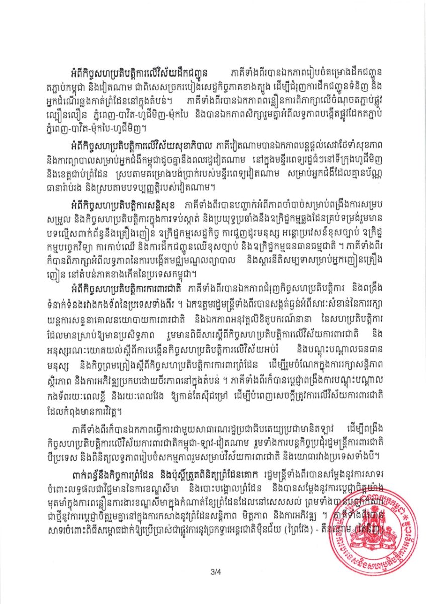 គួរបញ្ជាក់ថា ពាក់ពន្ធ័នឹងកិច្ចការព្រំដែន និងប៉ុស្តិ៍ត្រួតពិនិត្យព្រំដែនគោក រដ្ឋមន្ត្រីទាំងពីរបានសម្តែងនូវការសាទរ ចំពោះលទ្ធផលជាវិជ្ជមាននៃខណ្ឌសីមា និងការបោះបង្គោលព្រំដែន និងបានសម្តែងនូវការប្តេជ្ញាចិត្តយ៉ាងមុតមាំក្នុងការពន្លឿនការងារខណ្ឌសីមាក្នុងកំណាត់ខ្សែព្រំដែនដែលនៅសេសសល់ ព្រមទាំងបានបញ្ជាក់សារជាថ្មីនូវការប្តេជ្ញាចិត្តរួមគ្នានៅក្នុងការកសាងនូវព្រំដែនសន្តិភាព មិត្តភាព និងការអភិវឌ្ឍ៕