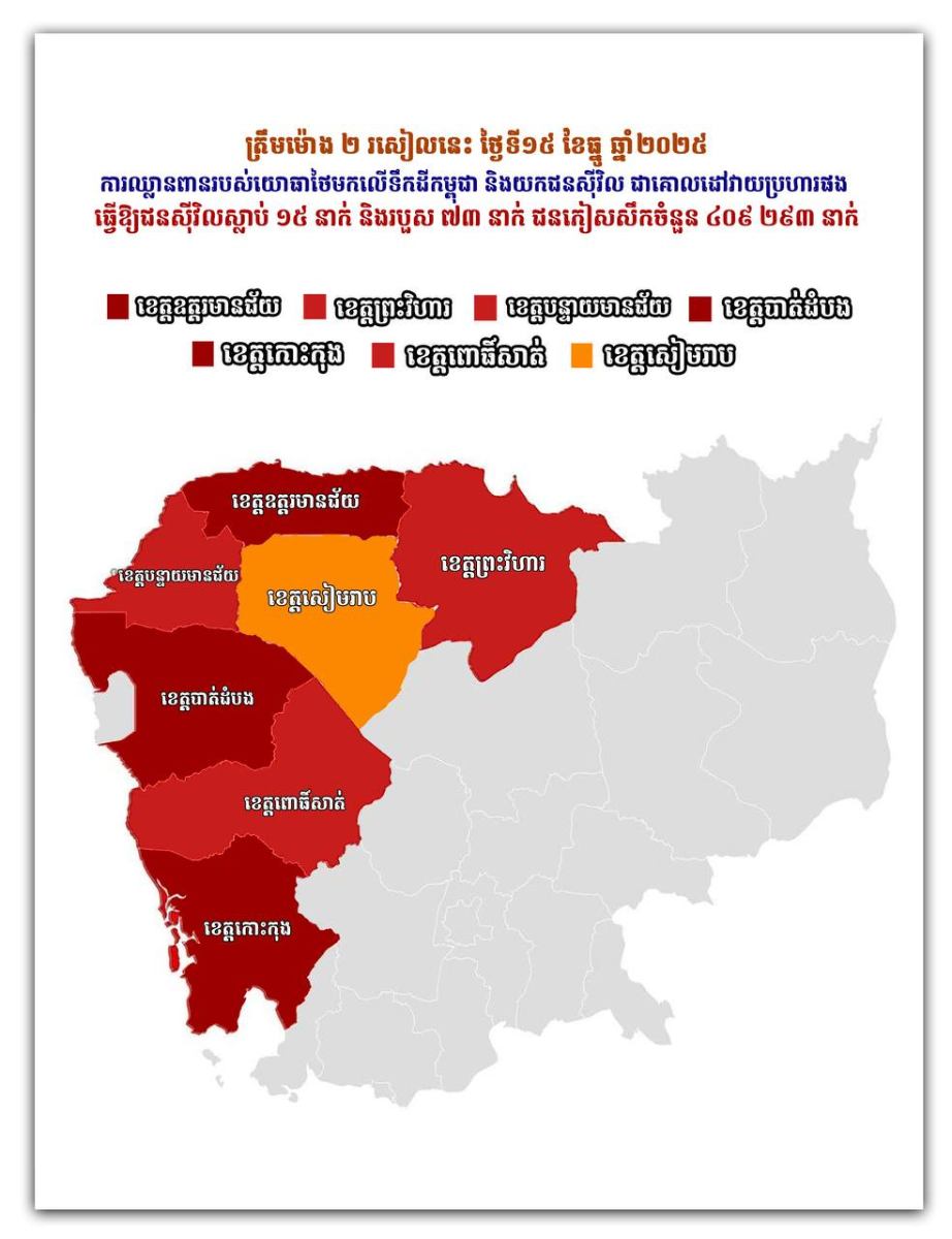 សូមបញ្ជាក់ថា តាមរយៈសារសង្គ្រាមឈ្លានពានវាតទីទឹកដីរបស់រដ្ឋាភិបាលក្រុងបាងកក និងយោធាថៃ គិតចាប់ពីរសៀលថ្ងៃទី៧ ខែធ្នូ មលដល់ម៉ោង២រសៀលថ្ងៃទី១៥ ខែធ្នូនេះ បានបណ្តាលឱ្យប៉ះពាល់យ៉ាងធ្ងន់ធ្ងរលើសុវត្ថិភាពប្រជាពលរដ្ឋ និងតំបន់ស៊ីវិលកម្ពុជាក្នុងខេត្តជាប់ព្រំដែនកម្ពុជា-ថៃ ក្នុងនោះពលរដ្ឋស្លាប់មានចំនួន១២នាក់ របួសចំនួន៧៤នាក់។ ចំណែកពលរដ្ឋភៀសសឹក ក្នុងខេត្តព្រះវិហារ ឧត្តរមានជ័យ បន្ទាយមានជ័យ បាត់ដំបង ពោធិ៍សាត់ កោះកុង និងខេត្តសៀមរាប មានកើនឡើងដល់ ១២០,៨១៤គ្រួសារ ស្មើនឹងមនុស្ស ៤០៣,៦០១នាក់ ក្នុងនោះស្ត្រីប្រមាណ ២សែន ៨ពាន់ នាក់ និងកុមារប្រមាណ ៩ម៉ឺន ៦ពាន់នាក់៕