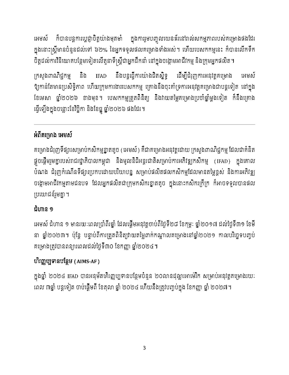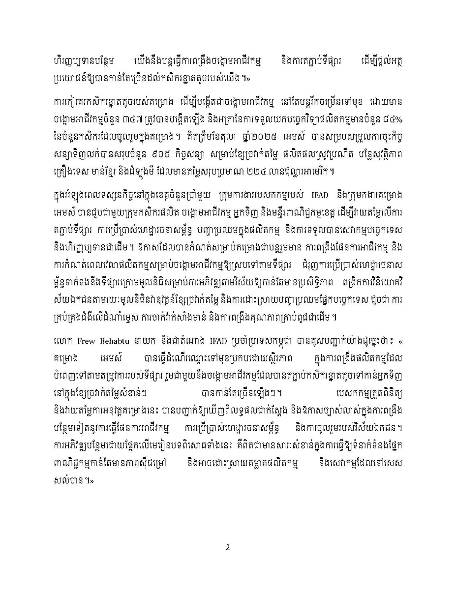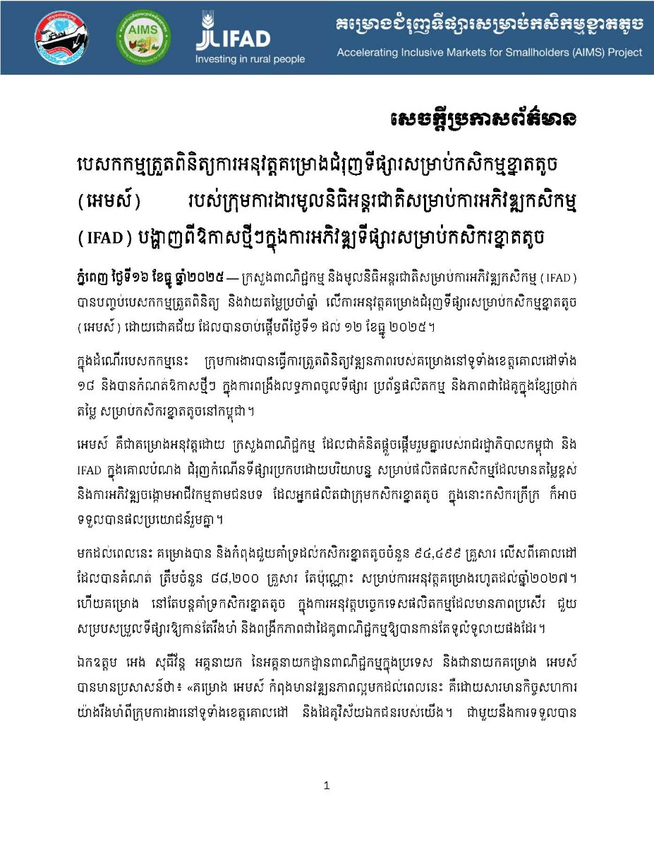 តាមរយៈ សេចក្តីប្រកាសព័ត៌មាន នៅថ្ងៃទី១៦ ខែធ្នូ ឆ្នាំ២០២៥ នេះ បានឱ្យដឹងថា ក្នុងដំណើរបេសកកម្មនេះ ក្រុមការងារបានធ្វើការត្រួតពិនិត្យវឌ្ឍនភាពរបស់គម្រោងនៅទូទាំងខេត្តគោលដៅទាំង១៨ និងបានកំណត់ឱកាសថ្មីៗ ក្នុងការពង្រឹងលទ្ធភាពចូលទីផ្សារ ប្រព័ន្ធផលិតកម្ម និងភាពជាដៃគូក្នុងខ្សែច្រវាក់តម្លៃ សម្រាប់កសិករខ្នាតតូចនៅកម្ពុជា។