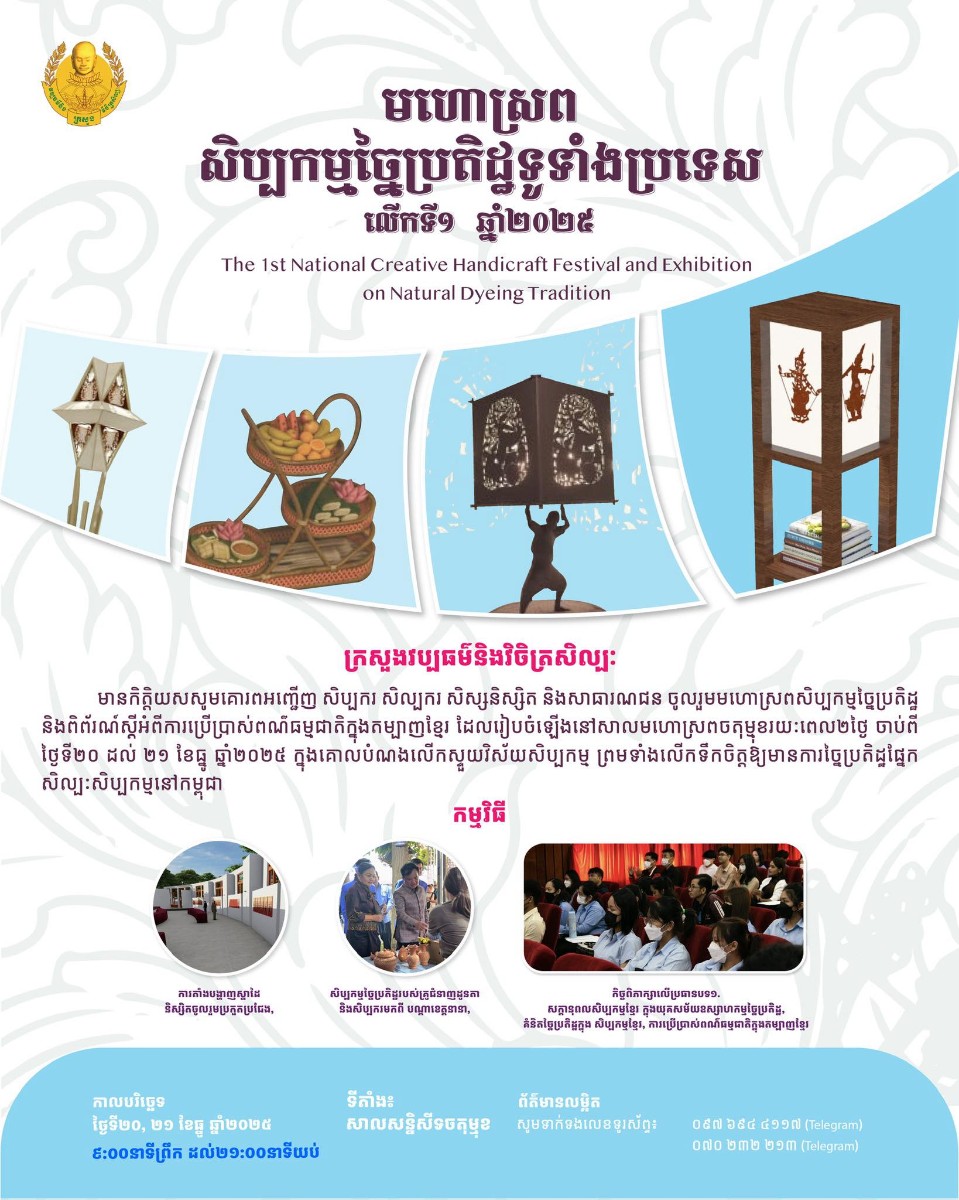 ក្រសួងវប្បធម៌ និងវិចិត្រសិល្បៈ នឹងរៀបចំកម្មវិធី “មហោស្រពសិប្បកម្មច្នៃប្រតិដ្ឋទូទាំងប្រទេសលើកទី១ ឆ្នាំ២០២៥” ក្នងគោលបំណងលើកស្ទួយវិស័យសិប្បកម្ម និងជំរុញលើកទឹកចិត្តឱ្យមានការច្នៃប្រតិដ្ឋក្នុងវិស័យសិប្បកម្មនៅកម្ពុជា នៅចុងសប្ដាហ៍នេះ ថ្ងៃសៅរ៍ និងថ្ងៃអាទិត្យ ទី២០ និង២១ ខែធ្នូ ឆ្នាំ២០២៥ នៅសាលចតុម្មុខ។