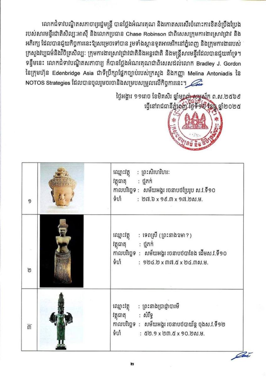 លោកជំទាវបណ្ឌិតសភាចារ្យរដ្ឋមន្ត្រី បានថ្លែងអំណរគុណ និងកោតសរសើរចំពោះការខិតខំប្រឹងប្រែង របស់សារមន្ទីរជាតិសិល្បៈអាស៊ី និងលោកប្រធាន Chase Robinson ជាពិសេសក្រុមការងារស្រាវជ្រាវ និង អភិរក្ស ដែលបានជួយកិច្ចការនេះឱ្យសម្រេចទៅបាន រួមទាំងស្ថានទូតអាមេរិកនៅភ្នំពេញ និងក្រុមការងាររបស់ ក្រសួងវប្បធម៌និងវិចិត្រសិល្បៈ ក្រុមការងារស្រាវជ្រាវជាតិនិងអន្តរជាតិ និងមន្ត្រីសារមន្ទីរដែលបានជួយគាំទ្រ។ ទន្ទឹមនេះ លោកជំទាវបណ្ឌិតសភាចារ្យ ក៏បានថ្លែងអំណរគុណជាពិសេសដល់លោក Bradley J. Gordon នៃក្រុមហ៊ុន Edenbridge Asia ជាទីប្រឹក្សាផ្នែកច្បាប់របស់ក្រសួង និងកញ្ញា Melina Antoniadis នៃ NOTOS Strategies ដែលបានចូលរួមចរចានិងសម្របសម្រួលលើកិច្ចការនេះ៕