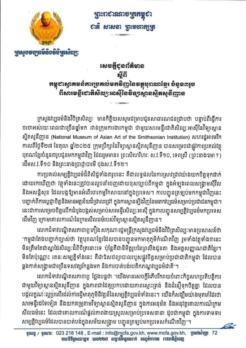 ក្រសួងវប្បធម៌ និងវិចិត្រសិល្បៈ មានកិត្តិយសសូមជម្រាបជូនសាធារណជនជ្រាបថា បន្ទាប់ពីធ្វើការចរចាអស់រយៈពេលជាច្រើនឆ្នាំមក រវាងក្រុមការងារកម្ពុជា ជាមួយសារមន្ទីរជាតិសិល្បៈអាស៊ីនៃវិទ្យាស្ថាន ស្និតសូនីញាន (National Museum of Asian Art of the Smithsonian Institution) សហរដ្ឋអាមេរិក កាលពីថ្ងៃទី២៧ ខែតុលា ឆ្នាំ២០២៥ ក្រុមប្រឹក្សានៃវិទ្យាស្ថានស្និតសូនីញាន បានសម្រេចជាផ្លូវការប្រគល់វត្ថុ បុរាណខ្មែរចំនួន៣រូបជូនមកកម្ពុជាវិញ ដែលរួមមាន៖ ព្រះសិរហរិហរៈ ស.វ.ទី១០, ទេពស្រី (ព្រះនាងឧមា?) ដើមស.វ.ទី១០ និងព្រះនាងប្រាជ្ញាបារមី ចុងស.វ.ទី១២។