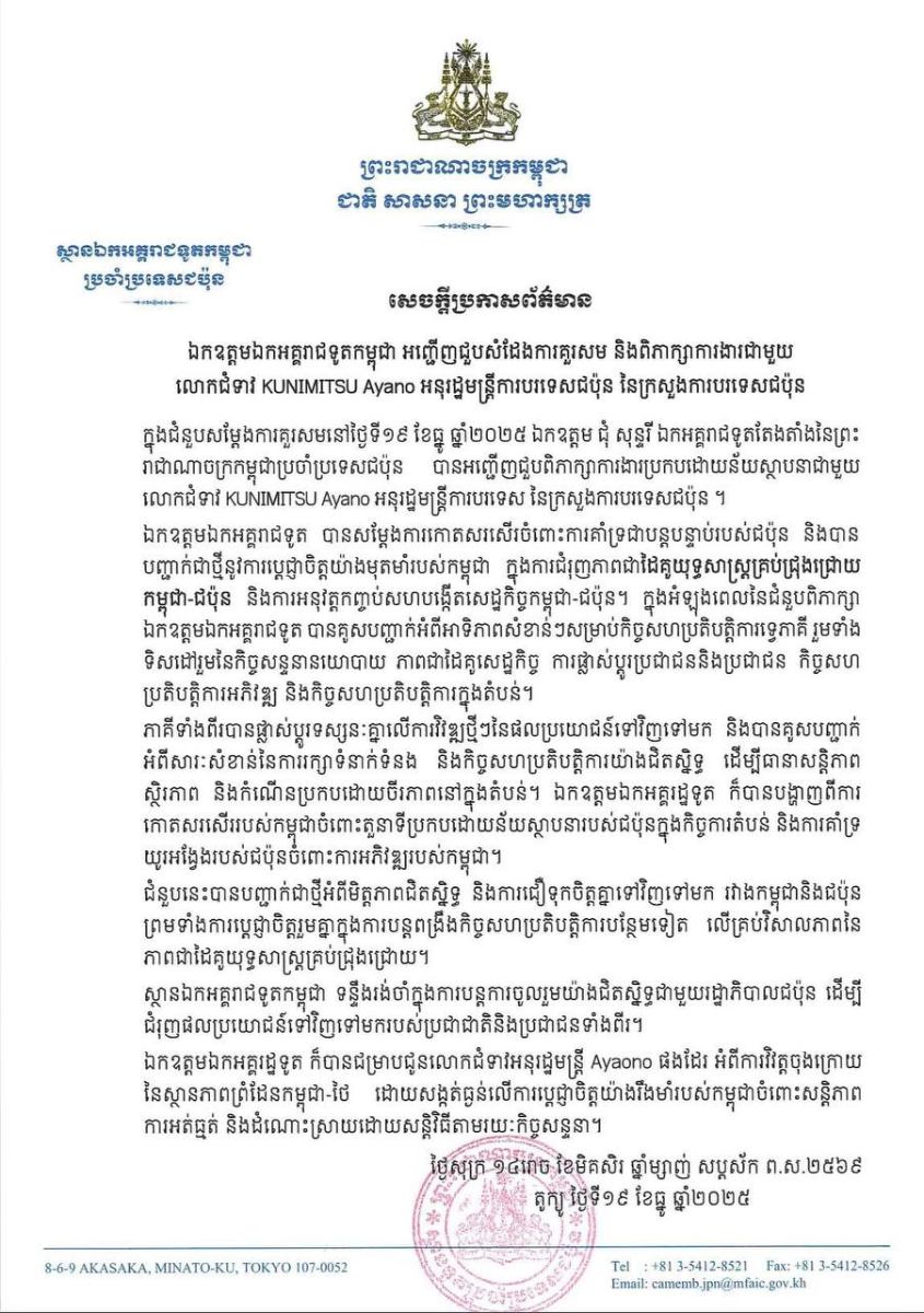 ឯកឧត្តមឯកអគ្គរដ្ឋទូត ក៏បានជម្រាបជូនលោកជំទាវអនុរដ្ឋមន្ត្រី Ayaono ផងដែរ អំពីការវិវត្តចុងក្រោយ នៃស្ថានភាពព្រំដែនកម្ពុជា-ថៃ ដោយសង្កត់ធ្ងន់លើការប្តេជ្ញាចិត្តយ៉ាងរឹងមាំរបស់កម្ពុជាចំពោះសន្តិភាព ការអត់ធ្មត់ និងដំណោះស្រាយដោយសន្តិវិធីតាមរយៈកិច្ចសន្ទនា។