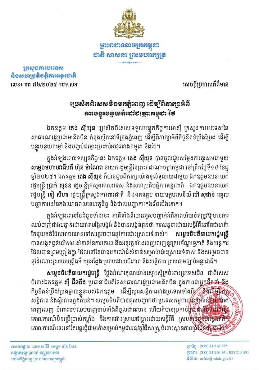 យោងតាមសេចក្ដីប្រកាសព័ត៌មានរបស់ក្រសួងការបរទេសកម្ពុជា បានឱ្យដឹងថា ឯកឧត្តម តេង ស៊ីឃុន ប្រេសិតពិសេសទទួលបន្ទុកកិច្ចការអាស៊ី ក្រសួងការបរទេសនៃ សាធារណរដ្ឋប្រជាមានិតចិន កំពុងស្ថិតនៅទីក្រុងភ្នំពេញ ដើម្បីពិភាក្សាអំពីកិច្ចខិតខំប្រឹងប្រែង ដើម្បី បន្ធូរបន្ថយកម្ដៅ និងបញ្ចប់ជម្លោះប្រដាប់អាវុធរវាងកម្ពុជា និងថៃ។ ក្នុងអំឡុងពេលទស្សនកិច្ចនេះ ឯកឧត្តម តេង ស៊ីឃុន បានចូលជួបសម្តែងការគួរសមជាមួយ សម្តេចមហាបវរធីបតី ហ៊ុន ម៉ាណែត នាយករដ្ឋមន្ត្រីនៃព្រះរាជាណាចក្រកម្ពុជា នៅព្រឹកថ្ងៃទី១៩ ខែធ្នូ ឆ្នាំ២០២៥។ ឯកឧត្តម តេង ស៊ីឃុន ក៏បានជួបពិភាក្សាយ៉ាងទូលំទូលាយជាមួយ ឯកឧត្តមឧបនាយក រដ្ឋមន្ត្រី ប្រាក់ សុខុន រដ្ឋមន្ត្រីក្រសួងការបរទេស និងសហប្រតិបត្តិការអន្តរជាតិ ឯកឧត្តមឧបនាយក រដ្ឋមន្ត្រី ទៀ សីហា រដ្ឋមន្ត្រីក្រសួងការពារជាតិ និងឯកឧត្តម នាយឧត្តមសេនីយ៍ ម៉ៅ សុផាន់ អគ្គមេ បញ្ជាការរងនៃកងយោធពលខេមរភូមិន្ទ និងជាមេបញ្ជាការកងទ័ពជើងគោក។