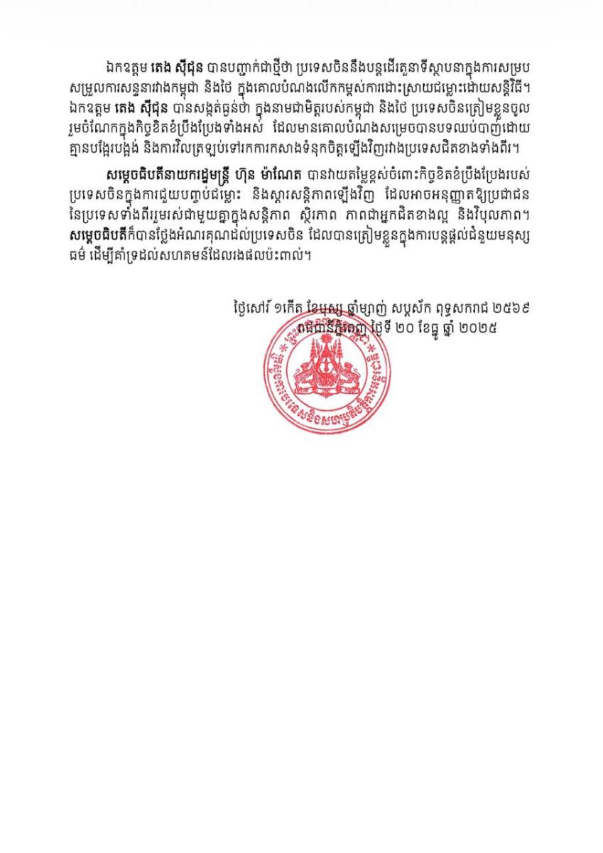 សម្តេចធិបតីនាយករដ្ឋមន្ត្រី ហ៊ុន ម៉ាណែត បានវាយតម្លៃខ្ពស់ចំពោះកិច្ចខិតខំប្រឹងប្រែងរបស់ ប្រទេសចិនក្នុងការជួយបញ្ចប់ជម្លោះ និងស្តារសន្តិភាពឡើងវិញ ដែលអាចអនុញ្ញាតឱ្យប្រជាជន នៃប្រទេសទាំងពីររួមរស់ជាមួយគ្នាក្នុងសន្តិភាព ស្ថិរភាព ភាពជាអ្នកជិតខាងល្អ និងវិបុលភាព។ សម្តេចធិបតីក៏បានថ្លែងអំណរគុណដល់ប្រទេសចិន ដែលបានត្រៀមខ្លួនក្នុងការបន្តផ្តល់ជំនួយមនុស្ស ធម៌ ដើម្បីគាំទ្រដល់សហគមន៍ដែលរងផលប៉ះពាល់៕
