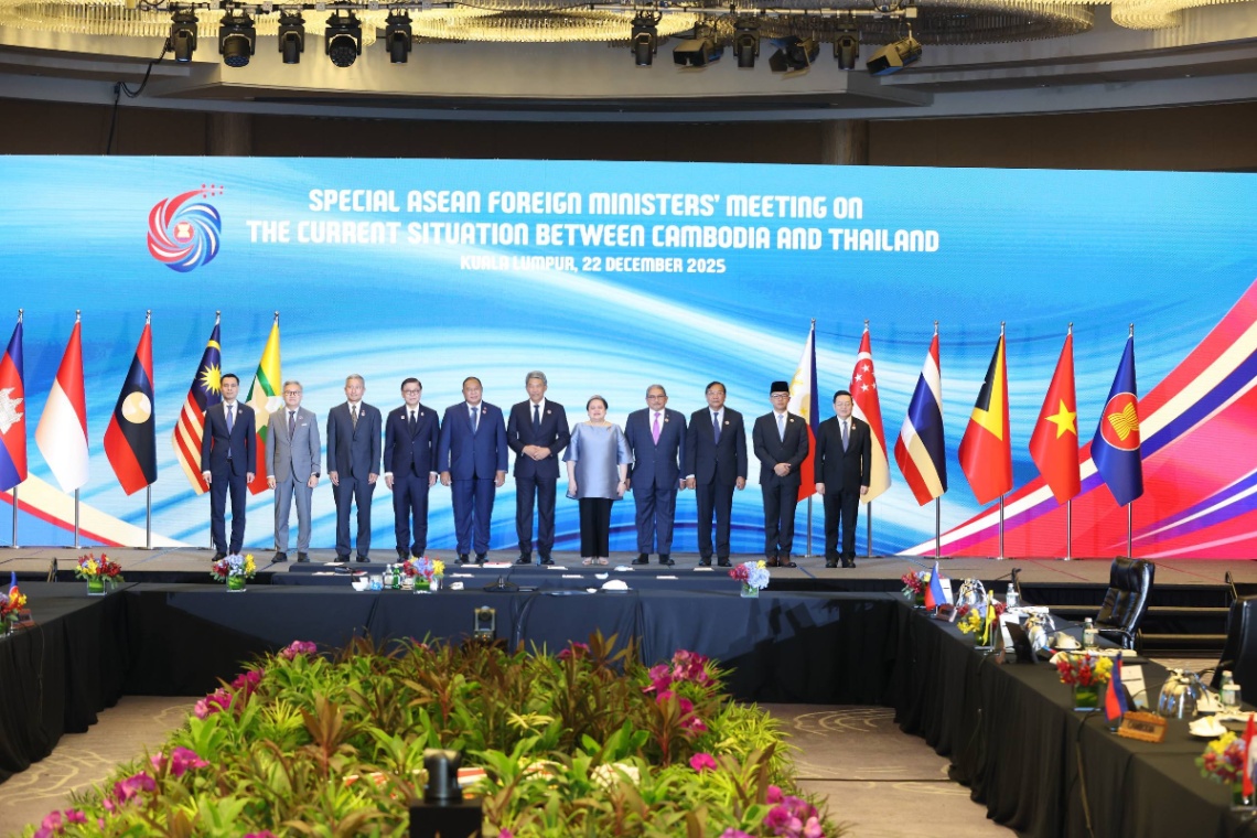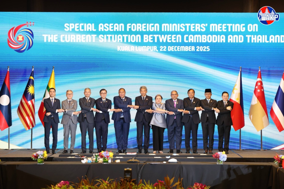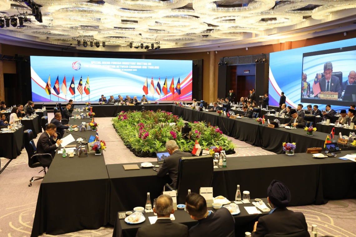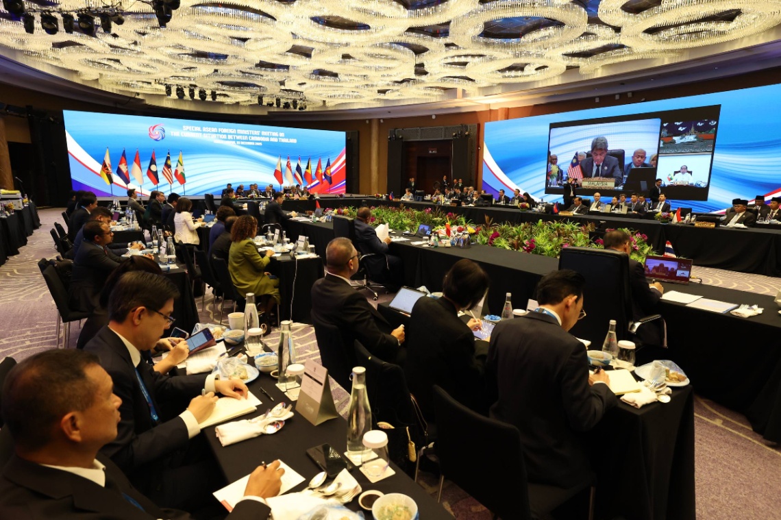 កិច្ចប្រជុំពិសេសរដ្ឋមន្ត្រីការបរទេសអាស៊ាន ស្តីពីស្ថានភាពបច្ចុប្បន្ន រវាងកម្ពុជា និងថៃ បានចាប់ផ្តើមហើយនៅព្រឹកថ្ងៃទី២២ ខែធ្នូ ឆ្នាំ២០២៥ នៅទីក្រុងគូឡាឡាំពួ ប្រទេសម៉ាឡេស៊ី ដែលដឹកនាំដោយឯកឧត្តម Mohamad Hasan រដ្ឋមន្ត្រីការបរទេសម៉ាឡេស៊ី និងមានការចូលរួមពីសំណាក់ឯកឧត្តម ប្រាក់ សុខុន ឧបនាយករដ្ឋមន្ត្រី រដ្ឋមន្ត្រីការបរទេស និងសហប្រតិបត្តិការអន្តរជាតិ នៃព្រះរាជាណាចក្រកម្ពុជា និងបណ្តារដ្ឋមន្ត្រីការបរទេសអាស៊ាន និងអគ្គលេខាធិការអាស៊ាន។ រូប៖ AKP