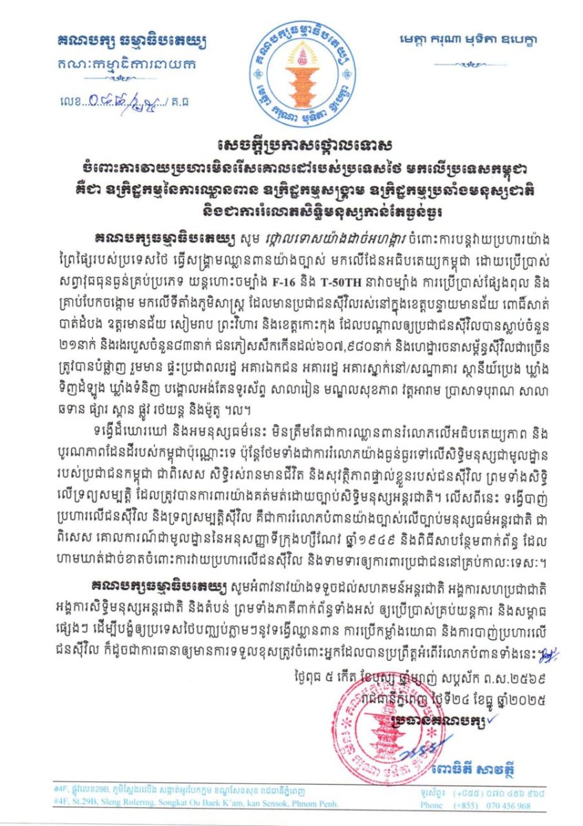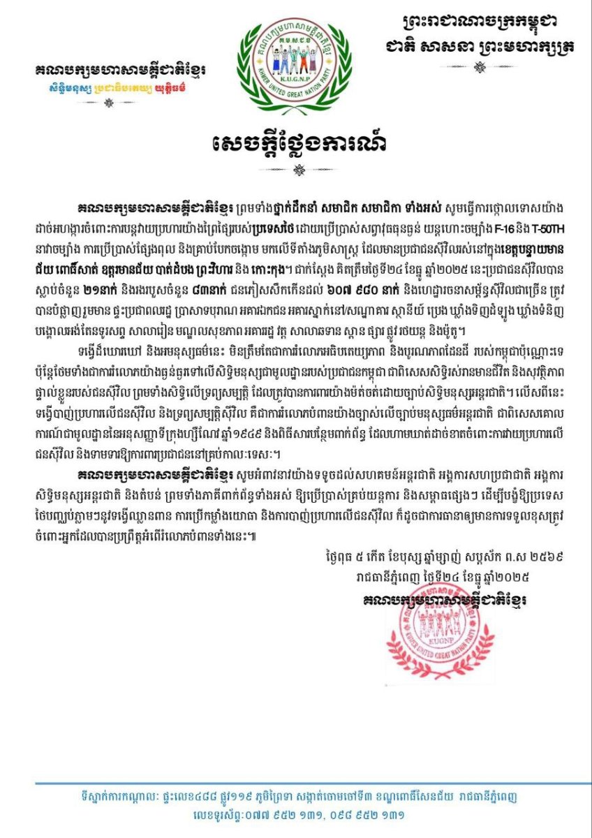 គណបក្ស នយោបាយចំនួន ២ គឺ គណបក្សធម្មាធិបតេយ្យ និង គណបក្សមហាសាមគ្គីជាតិខ្មែរ នៅថ្ងៃទី២៤ ខែធ្នូ ឆ្នាំ២០២៥ បានចាប់ផ្ដើមជាថ្មីក្នុងការ ថ្កោលទោសយ៉ាងដាច់អហង្ការ ចំពោះការបន្តវាយប្រហារយ៉ាង ព្រៃផ្សៃរបស់ប្រទេសថៃ ធ្វើសង្គ្រាមឈ្លានពានយ៉ាងច្បាស់ មកលើដែនអធិបតេយ្យកម្ពុជា ដោយប្រើប្រាស់ សព្វាវុធធុនធ្ងន់គ្រប់ប្រភេទ យន្តហោះចម្បាំង F-16 និង T-5oTH នាវាចម្បាំង ការប្រើប្រាស់ផ្សែងពុល និង គ្រាប់បែកចង្កោម មកលើទីតាំងភូមិសាស្ត្រ ដែលមានប្រជាជនស៊ីវិលរស់នៅក្នុងខេត្តបន្ទាយមានជ័យ ពោធិ៍សាត់ បាត់ដំបង ឧត្តរមានជ័យ សៀមរាប ព្រះវិហារ និងខេត្តកោះកុង។
