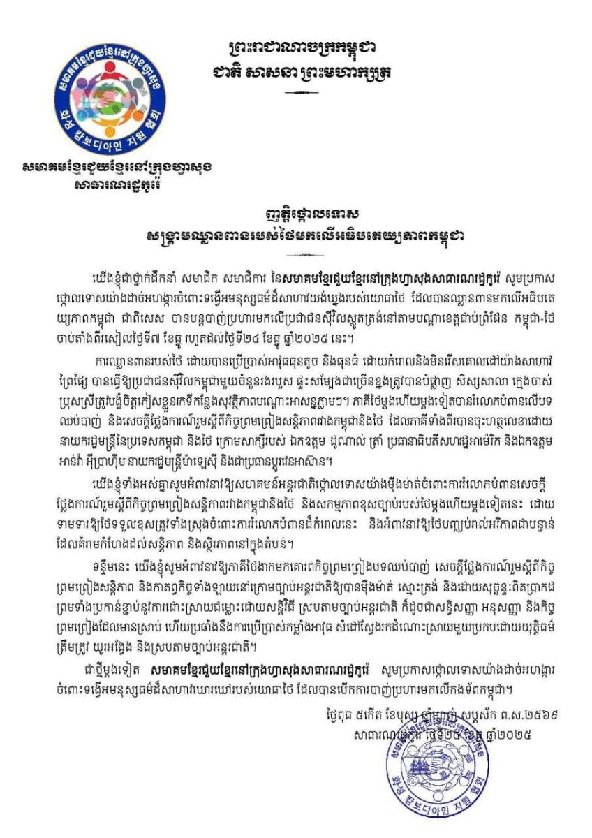 សមាគមខ្មែរនៅកូរ៉េ ប្រកាសថ្កោលទោសយ៉ាងដាច់អហង្ការ​ចំពោះសង្គ្រាមឈ្លានពាន​របស់ថៃមក​លើអធិបតេយ្យភាព​​នៃព្រះរាជាណាចក្រកម្ពុជា