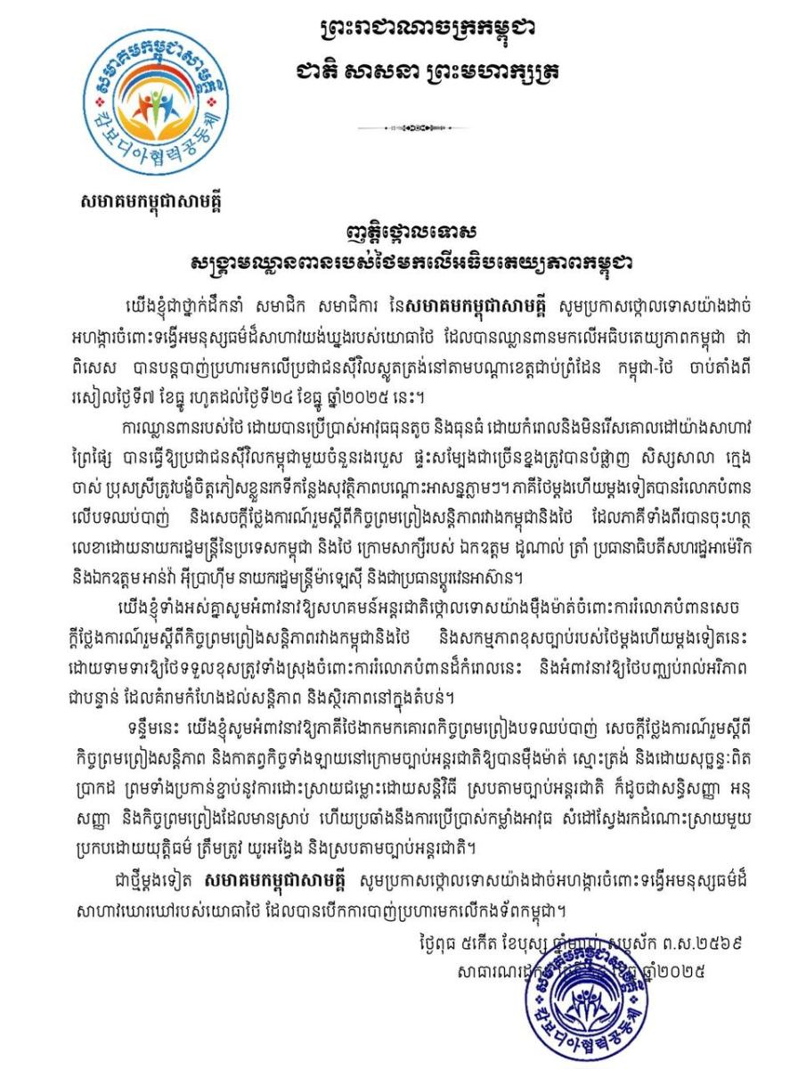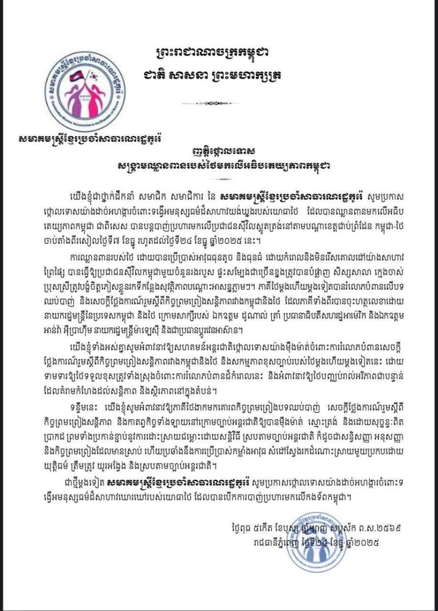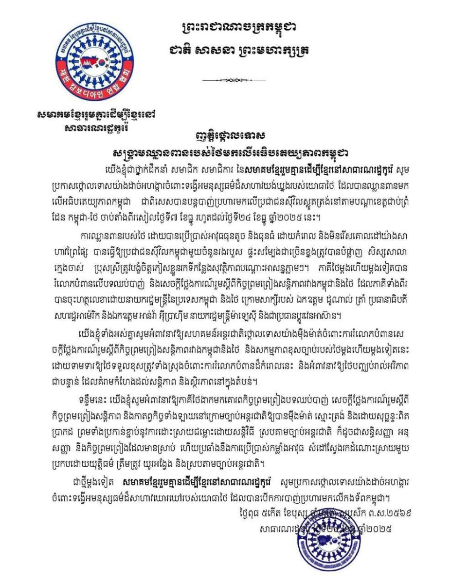 សមាគមខ្មែរនៅកូរ៉េ នៅថ្ងៃទី២៤ ខែធ្នូ ឆ្នាំ២០២៥ បានចេញញត្តិថ្កោលទោសយ៉ាងដាច់អហង្ការចំពោះទង្វើអមនុស្សធម៌ដ៏សាហាវយង់ឃ្នងរបស់យោធាថៃ ដែលបានឈ្លានពានមកលើអធិបតេយ្យភាពនៃព្រះរាជាណាចក្រកម្ពុជា ជាពិសេស បានបន្តបាញ់ប្រហារមកលើប្រជាជនស៊ីវិលស្លូតត្រង់នៅតាម បណ្តាខេត្តជាប់ព្រំដែនកម្ពុជា ថៃ ចាប់តាំងពីរសៀលថ្ងៃទី៧ ខែធ្នូ រហូតដល់ថ្ងៃទី២៤ ខែធ្នូ ឆ្នាំ២០២៥នេះ។