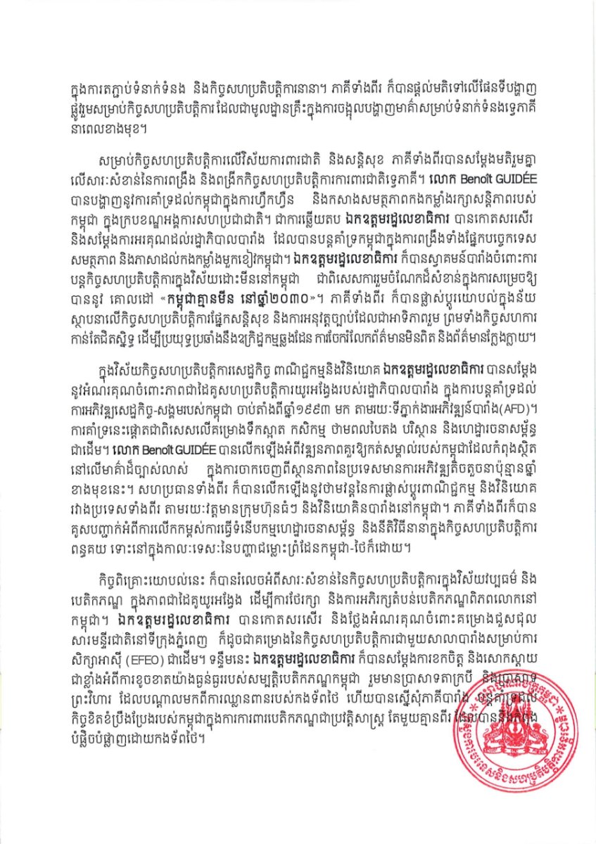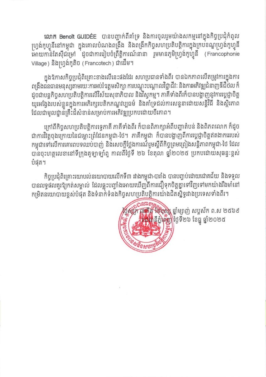 យោងតាម សេចក្តីប្រកាសព័ត៌មាន របស់ ក្រសួងការបរទេស និងសហប្រតិបត្តិការអន្តរជាតិ នៃព្រះរាជាណាចក្រកម្ពុជា ចេញនៅថ្ងៃទី២៦ ខែធ្នូ ឆ្នាំ២០២៥ នេះ បានបង្ហាញថា ក្នុងឱកាសកិច្ចប្រជុំពិគ្រោះខាងលើនេះផងដែរ សហប្រធានទាំងពីរ បានឯកភាពលើតម្រូវការក្នុងការ ពង្រឹងធនធានមនុស្សតាមរយៈការអប់រំឧត្តមសិក្សា ការបណ្តុះបណ្តាលវិជ្ជាជីវៈ និងការអភិវឌ្ឍជំនាញឌីជីថល ក៏ដូចជាបន្តកិច្ចសហប្រតិបត្តិការលើវិស័យសុខាភិបាល និងវិស្វកម្ម។ ភាគីទាំងពីរក៏បានបង្ហាញនូវការប្តេជ្ញាចិត្ត យូរអង្វែងរបស់ខ្លួនក្នុងការអភិរក្សបេតិកភណ្ឌវប្បធម៌ និងគាំទ្រដល់ការសន្ទនាដោយសន្តិវិធី និងស្ថិរភាព ដែលជាមូលដ្ឋានគ្រឹះដ៏សំខាន់សម្រាប់ការអភិវឌ្ឍប្រកបដោយចីរភាព។