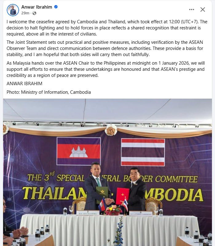 ឯកឧត្តម អាន់វ៉ា អ៊ីប្រាហ៊ីម នាយករដ្ឋមន្ត្រីម៉ាឡេស៊ី និងជាប្រធានអាស៊ានប្ដូរវេន នៅរសៀលថ្ងៃទី២៧ ខែធ្នូ ឆ្នាំ២០២៥នេះ បានប្រកាសស្វាគមន៍ចំពោះបទឈប់បាញ់រវាង កម្ពុជា-ថៃដែលចូលជាធរមាននៅម៉ោង១២ថ្ងៃត្រង់ ថ្ងៃទី២៧ ខែធ្នូនេះ និងគាំទ្រកិច្ចខិតខំប្រឹងប្រែងទាំងអស់ដើម្បីធានាថាកិច្ចព្រមព្រៀងនេះត្រូវបានគោរព។