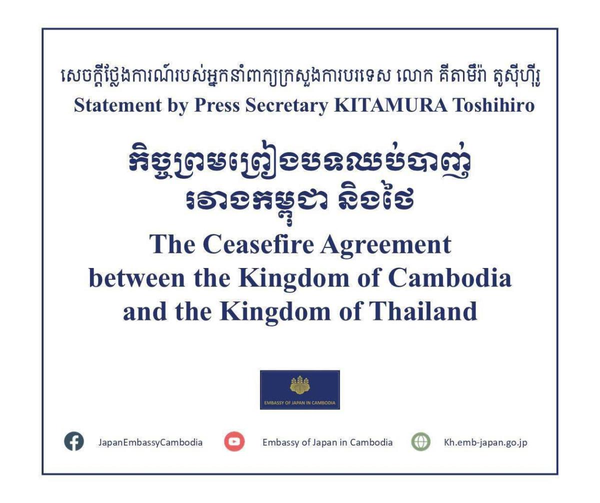 ជាមួយគ្នានេះ ប្រទេសជប៉ុន ក៏បានប្រកាសស្វាគមន៍ ចំពោះកិច្ចព្រមព្រៀងឈប់បាញ់រវាងកម្ពុជា និងថៃ និងសង្ឃឹមយ៉ាងមុតមាំ ថា កិច្ចព្រមព្រៀងនេះនឹងត្រូវបានអនុវត្តយ៉ាងប្រាកដប្រជា។ នេះបើតាម សេចក្តីថ្លែងការណ៍របស់អ្នកនាំពាក្យក្រសួងការបរទេសជប៉ុន។
