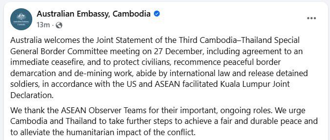 ចំណែកប្រទេសអូស្ត្រាលីក៏បានប្រកាស ស្វាគមន៍ចំពោះកិច្ចព្រមព្រៀងឈប់បាញ់ជាបន្ទាន់ជាមួយគ្នា រវាងកម្ពុជា និងថៃនេះ ដើម្បីការពារជនស៊ីវិល និងឈានទៅការវាសវែងកំណត់ព្រំដែនដោយសន្តិវិធី គោរពតាមច្បាប់អន្តរជាតិ និងដោះលែងទាហានកម្ពុជាដែលត្រូវបានឃុំខ្លួន។