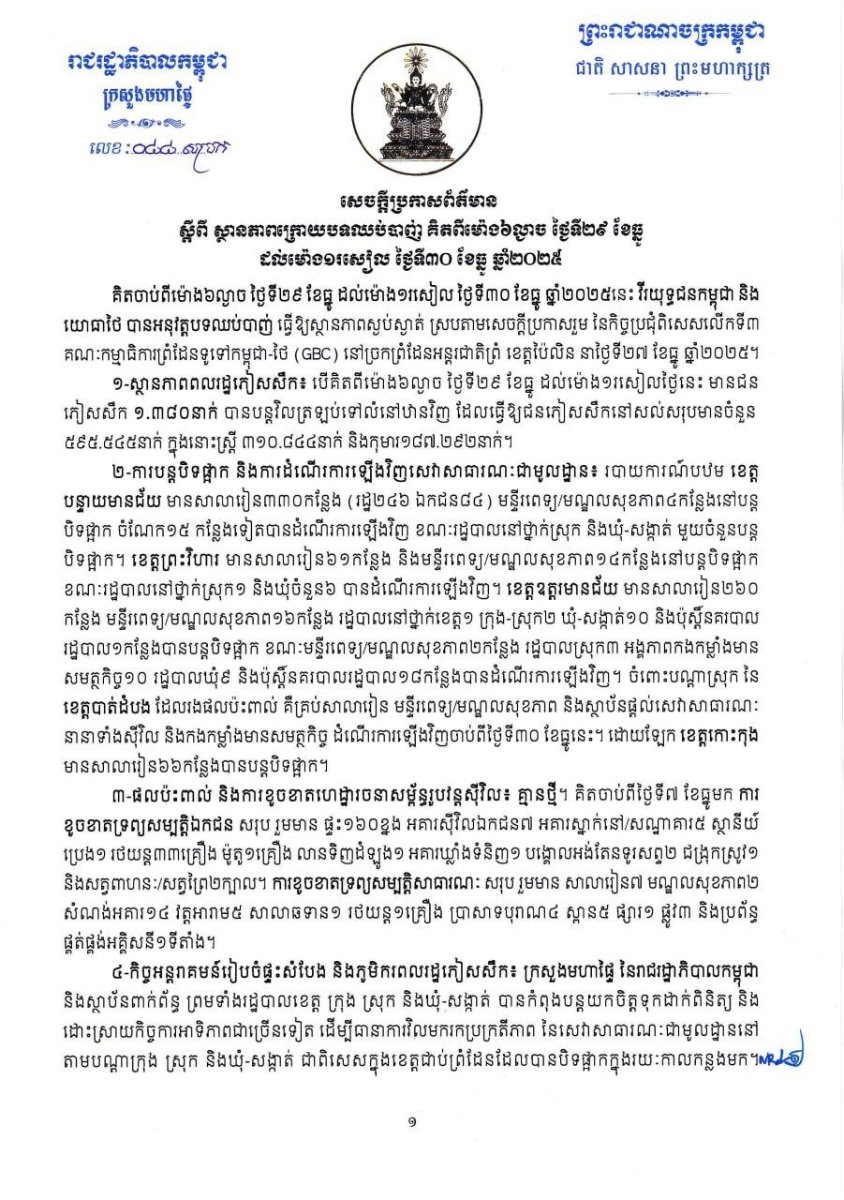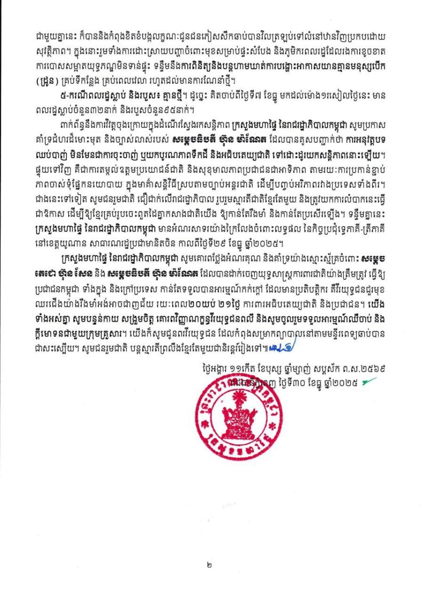 ក្រសួងមហាផ្ទៃ នៅថ្ងៃទី៣០ ខែធ្នូ ឆ្នាំ២០២៥ នេះ បានចេញ សេចក្តីប្រកាសព័ត៌មាន ស្ដីពី ស្ថានភាពក្រោយបទឈប់បាញ់ គិតពីម៉ោង៦ល្ងាច ថ្ងៃទី២៩ ខែធ្នូ ដល់ម៉ោង១រសៀល ថ្ងៃទី៣០ ខែធ្នូ ឆ្នាំ២០២៥។ ក្រសួងមហាផ្ទៃ បានឱ្យដឹងថា វីរយុទ្ធជនកម្ពុជា និង យោធាថៃ បានអនុវត្តបទឈប់បាញ់ ធ្វើឱ្យស្ថានភាពស្ងប់ស្ងាត់ ស្របតាមសេចក្ដីប្រកាសរួម នៃកិច្ចប្រជុំពិសេសលើកទី៣ គណៈកម្មាធិការព្រំដែនទូទៅកម្ពុជា-ថៃ (GBC) នៅច្រកព្រំដែនអន្តរជាតិព្រំ ខេត្តប៉ៃលិន នាថ្ងៃទី២៧ ខែធ្នូ ឆ្នាំ២០២៥។