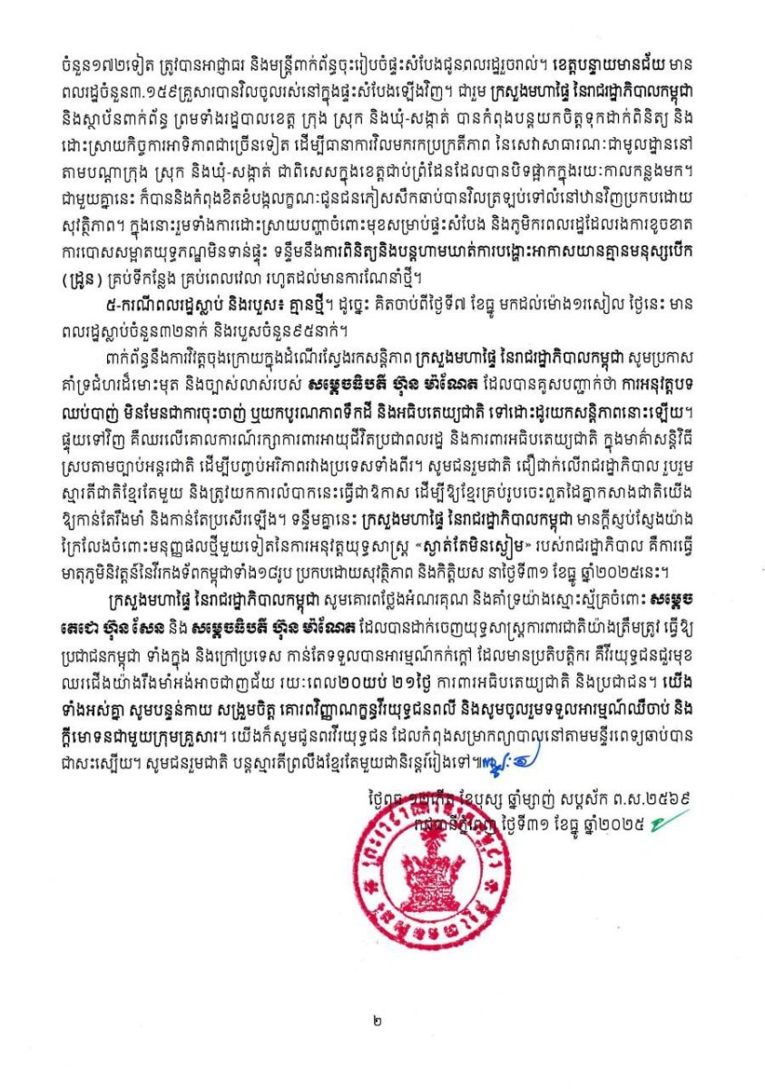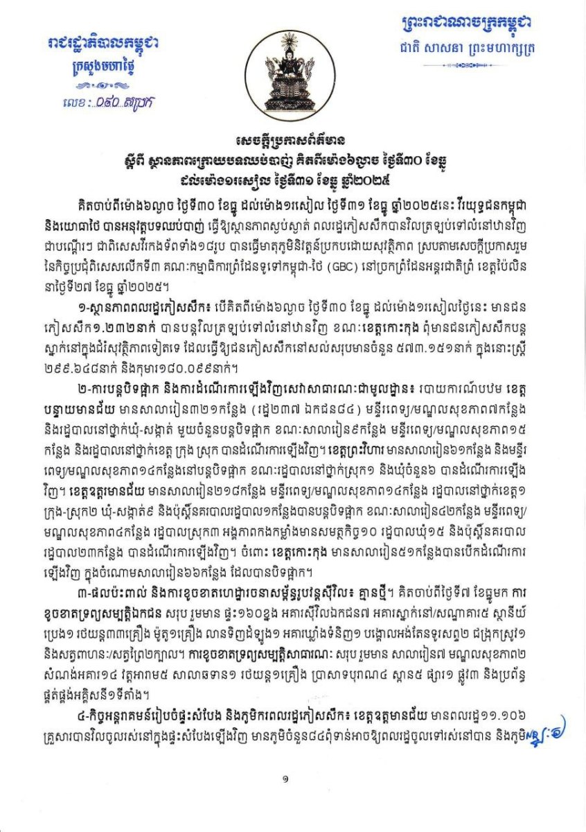 ក្រសួងមហាផ្ទៃ នៅរសៀលនេះ បានចេញសេចក្ដីប្រកាសព័ត៌មាន ស្ដីពី ស្ថានភាពក្រោយបទឈប់បាញ់ គិតពីម៉ោង ៦ល្ងាច ថ្ងៃទី៣០ ខែធ្នូ ដល់ម៉ោង ១រសៀល ថ្ងៃទី៣១ ខែធ្នូ ឆ្នាំ២០២៥ ដោយបានបង្ហាញ ពីការបន្តបិទផ្អាក និងការដំណើរការឡើងវិញសេវាសាធារណៈជាមូលដ្ឋានតាម របាយការណ៍បឋម៖