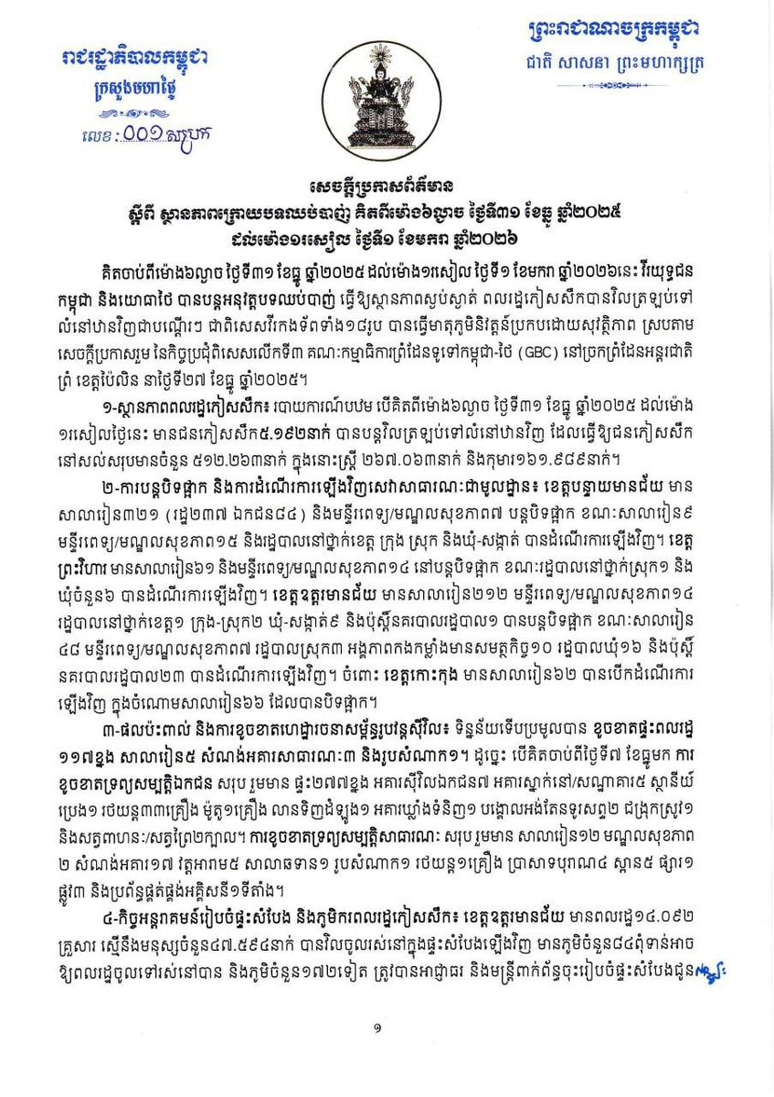 តាមរយៈ សេចក្តីប្រកាសព័ត៌មាន ក្រសួងមហាផ្ទៃ ស្ដីពី ស្ថានភាពក្រោយបទឈប់បាញ់ គិតពីម៉ោង ៦ល្ងាច ថ្ងៃទី៣១ ខែធ្នូ ឆ្នាំ២០២៥ ដល់ម៉ោង ១រសៀលថ្ងៃនេះ បានឱ្យដឹងចំពោះ ការបន្តបិទផ្អាក និងការដំណើរការឡើងវិញសេវាសាធារណៈជាមូលដ្ឋានខេត្តរងផលប៉ះពាល់ ដូចខាងក្រោម៖