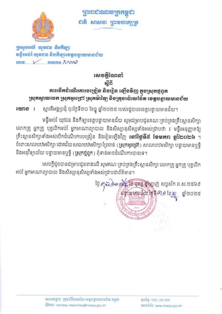 យោងតាមស្មារតីអង្គប្រជុំរបស់រដ្ឋបាលខេត្តបន្ទាយមានជ័យ មន្ទីរអប់រំ យុវជន និងកីឡាខេត្ត បានបញ្ជាក់ថា គ្រឹះស្ថានសិក្សាទាំងអស់នឹងបើកដំណើរការបង្រៀន និងរៀនឡើងវិញនៅថ្ងៃទី៥ ខែមករា ឆ្នាំ២០២៦។