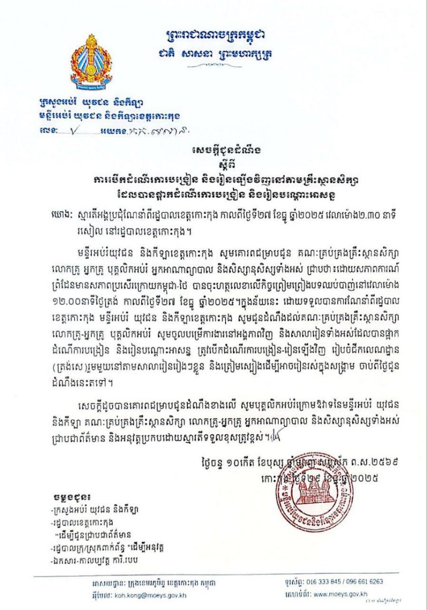 ជាមួយគ្នានេះដែរកាលពីថ្ងៃទី២៩ ខែធ្នូ ឆ្នាំ២០២៥ មន្ទីរអប់រំ យុវជន និងកីឡាខេត្តកោះកុង ក៏បានជូនដំណឹងពីការបើកដំណើរការបង្រៀន និងរៀនឡើងវិញនៅតាមគ្រឹះស្ថានសិក្សាដែលបានផ្អាកដំណើរការកន្លងទៅ។ ក្នុងនោះក៏បានឲ្យរៀបចំជីកជាលេណដ្ឋាន(ត្រង់សេ) រួមមួយនៅតាមសាលារៀនរៀងៗខ្លួន និងត្រៀមស្បៀងដើម្បីអាចរៀនរស់ក្នុងសង្គ្រាមផងដែរ។