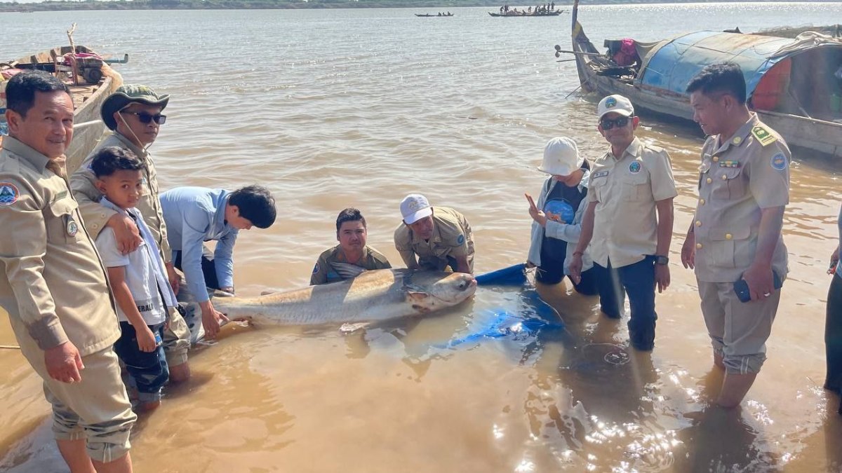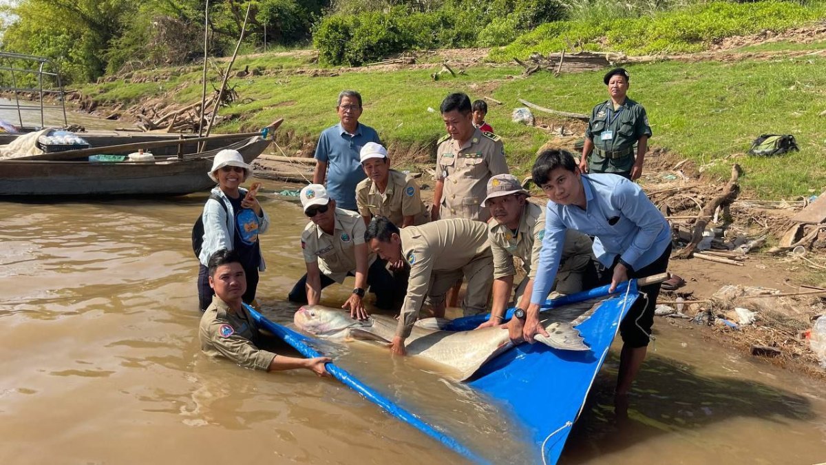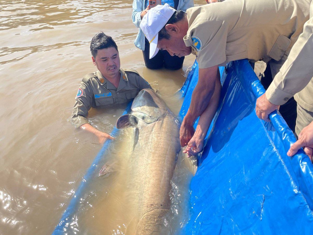 មន្ត្រីជំនាញជលផលលែងត្រីរាជមួយក្បាលទម្ងន់ ៦៣គីឡូក្រាម ចូលទន្លេមេគង្គវិញក្រោយទទួលបានពីប្រជានេសាទ និងដាក់ឈ្មោះ «រំដួលកងមាស» មានលេខកូដ ០៣៩