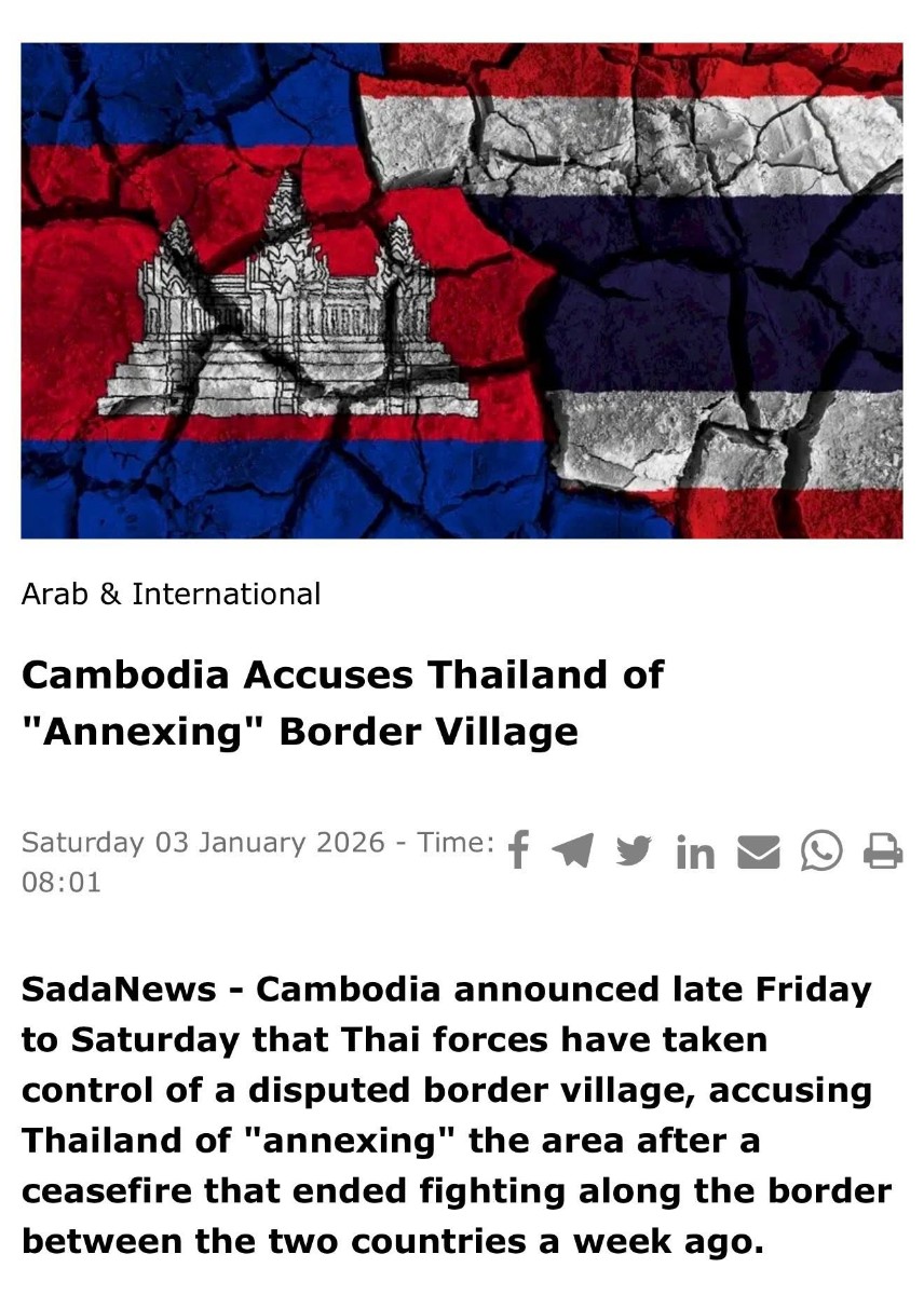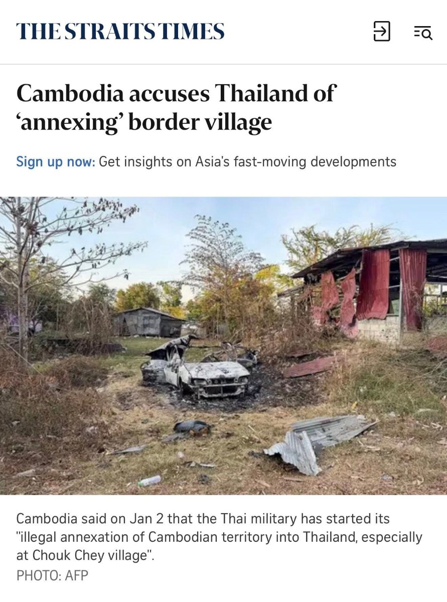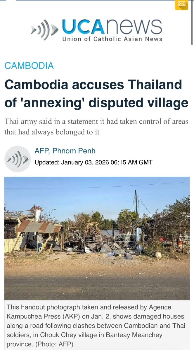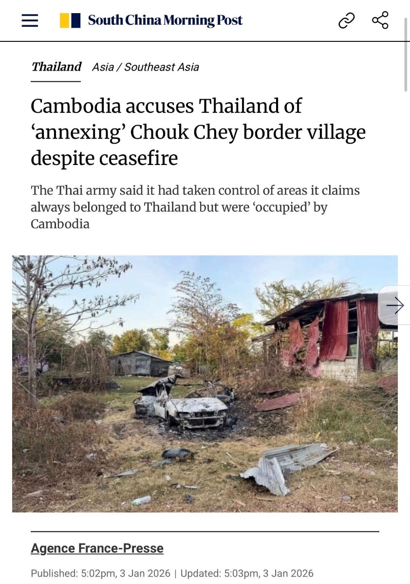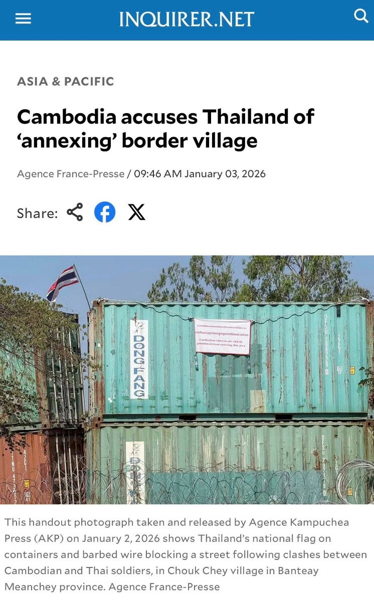 តាមរយៈបណ្ដាញសង្គមហ្វេសប៊ុកថ្ងៃទី០៤ ខែមករា ឆ្នាំ២០២៦ ឯកឧត្ដមរដ្ឋមន្ត្រីក្រសួងព័ត៌មានបានថ្លែងថា នៅថ្ងៃទី២ និងទី៣ ខែមករា ឆ្នាំ២០២៦ សារព័ត៌មាននានានៅលើពិភពលោកបានផ្សព្វផ្សាយព័ត៌មានអំពីយោធាថៃបានរំលោភបំពានមកលើទឹកដីកម្ពុជាក្រោយបទឈប់បាញ់ចូលជាធរមាន ដោយបានដាក់កុងតឺន័រ រាយបន្លាលួស និងដាក់ទងជាតិលើទឹកដីកម្ពុជា និងប្រកាសថាជាទឹកដីខ្លួនទៅវិញ។ ឯកឧត្ដមបន្តថា សារព័ត៌មាននានាបានដកស្រង់ខ្លឹមសារនៃសេចក្តីថ្លែងការណ៍របស់ក្រសួងការបរទេស និងសហប្រតិបត្តិការអន្តរជាតិកម្ពុជាដែលបញ្ជាក់ពីការឈ្លានពានរបស់យោធាថៃមកលើទឹកដីកម្ពុជា។ ការកាន់កាប់ទឹកដីកម្ពុជាដោយកងទ័ពថៃ ក្រោយបទឈប់បាញ់ និងវាយកម្ទេចផ្ទះសម្បែងប្រជាជន និងហេដ្ឋារចនាសម្ព័ន្ធ ជាការរំលោភយ៉ាងជាក់ច្បាស់ចំពោះគោលការណ៍ជាមូលដ្ឋាននៃច្បាប់អន្តរជាតិ ក៏ដូចជាច្បាប់មនុស្សធម៌ និងច្បាប់សិទ្ធិមនុស្សអន្តរជាតិ។ សារព័ត៌មានបានលើកឡើងពីផែនការថៃដែលភ្ជាប់តំបន់មួយចំនួនរបស់កម្ពុជាទៅនឹងទឹកដីរបស់ខ្លួនដោយខុសច្បាប់។